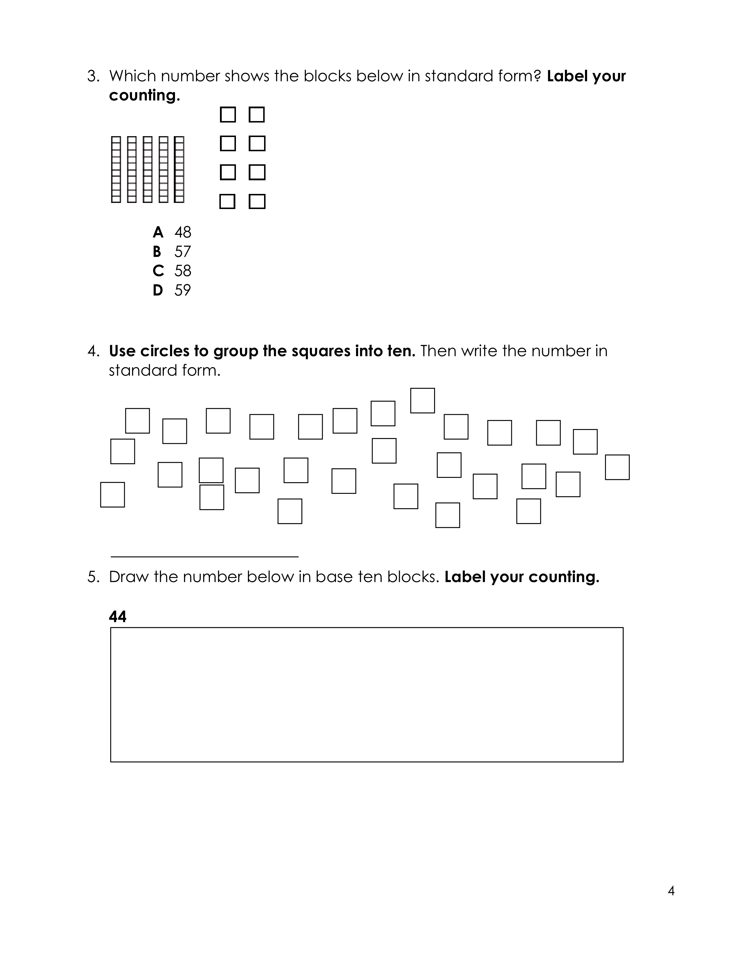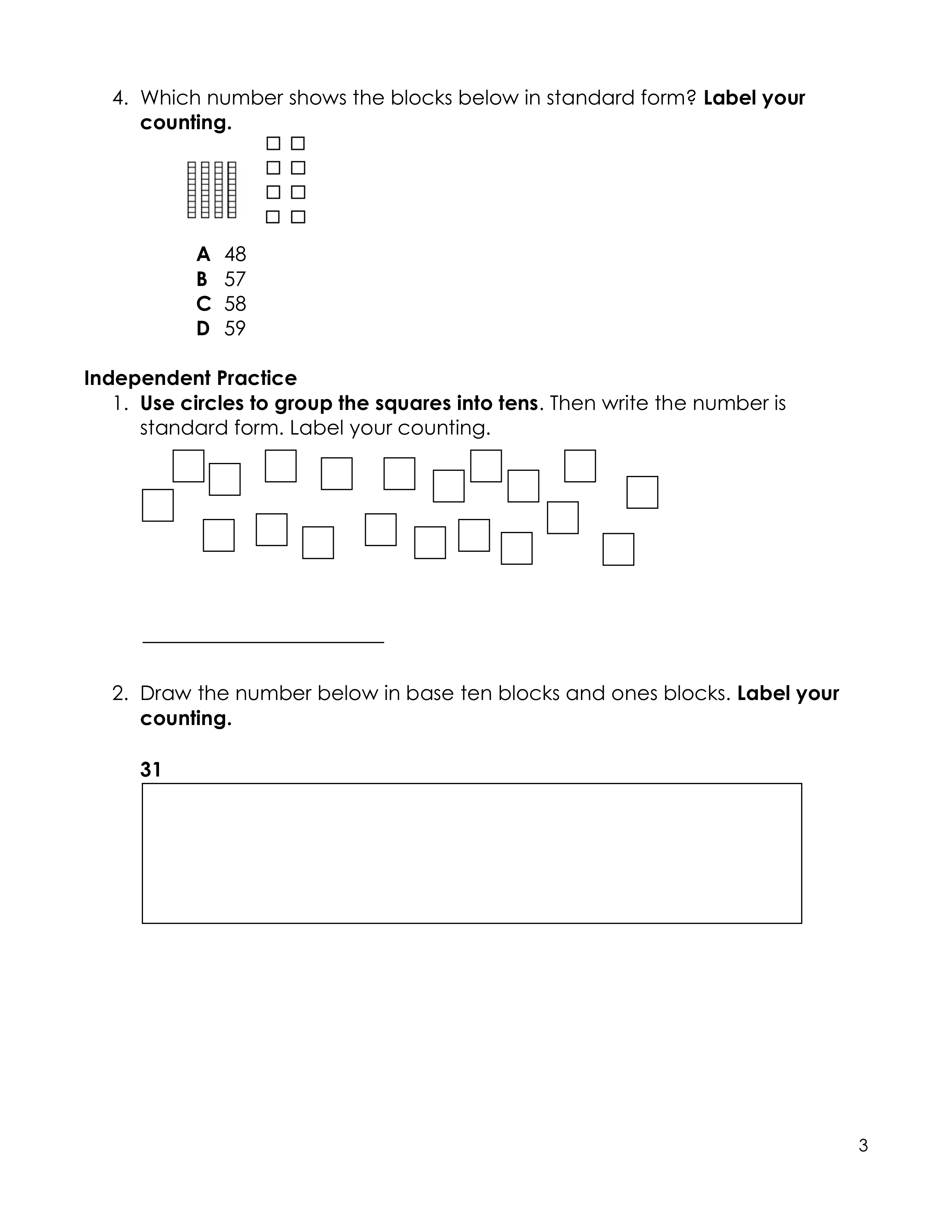 Use circles to group the squares into tens. Then write the number in standard form. Label your counting.