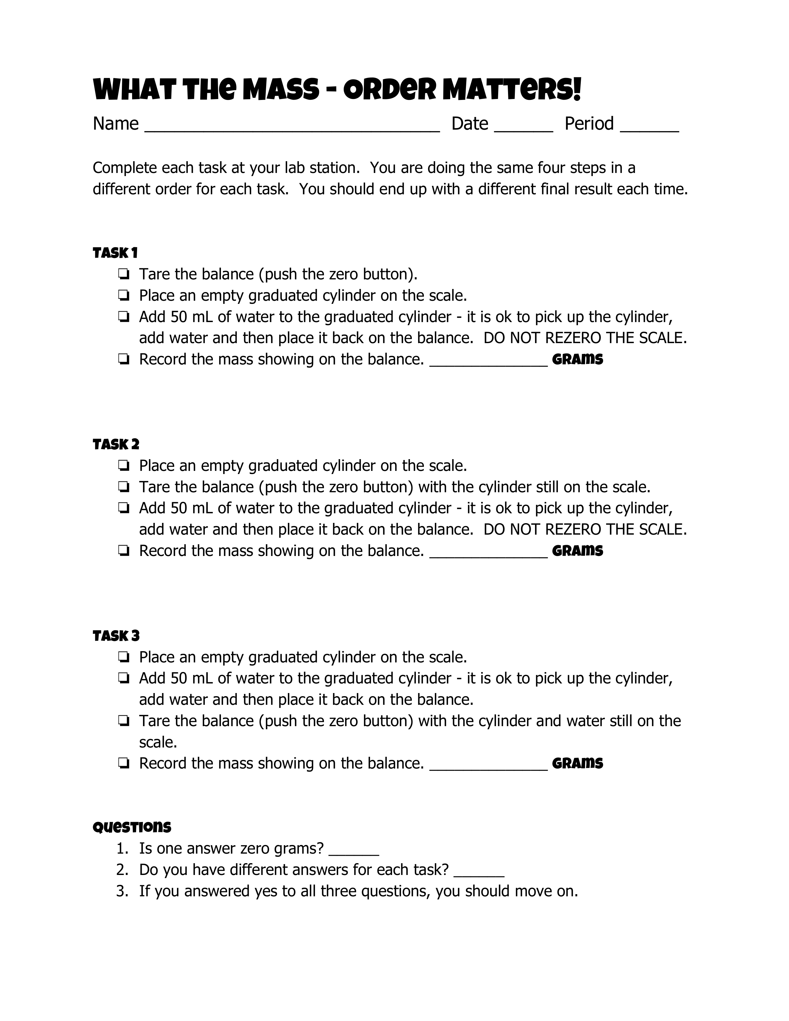Which task "zeros" out the mass of the container so that you can only measure the mass of the stubstance you need for your lab?