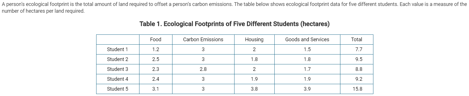 If Student 2 wanted to change his or her footprint to be more similar to that of Student 1, which of the following actions would he or she choose based on the data given in table 1?