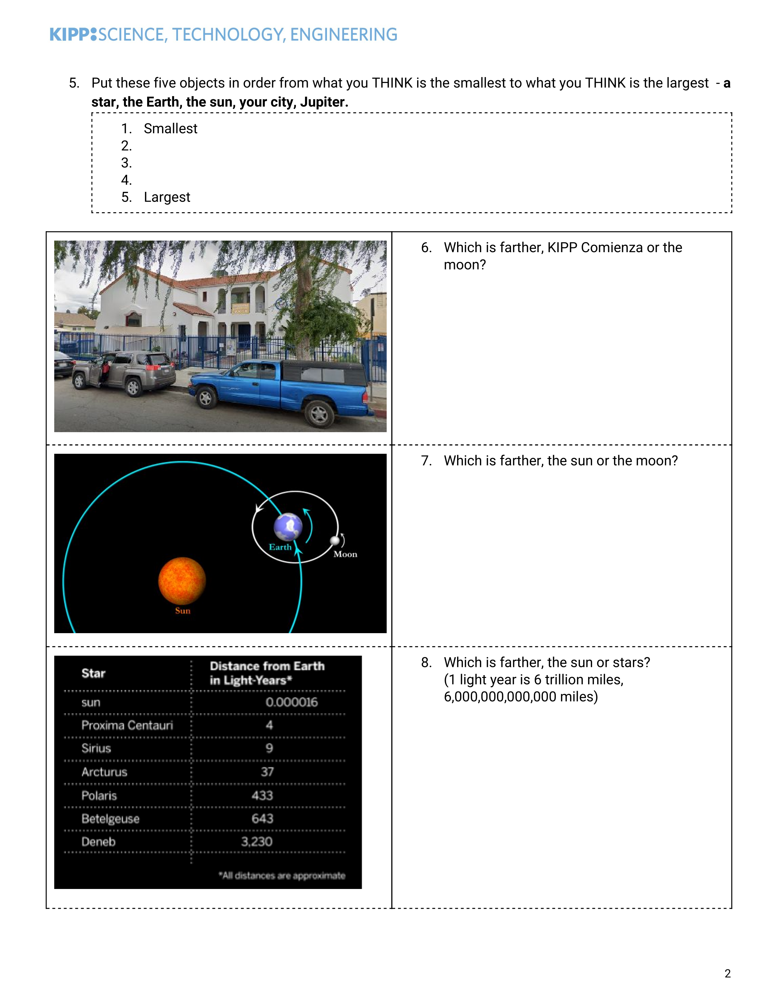 Put these four objects in order from what you THINK is the closest to us what you THINK is the furthest away from us - a star, the moon, your school, the sun.