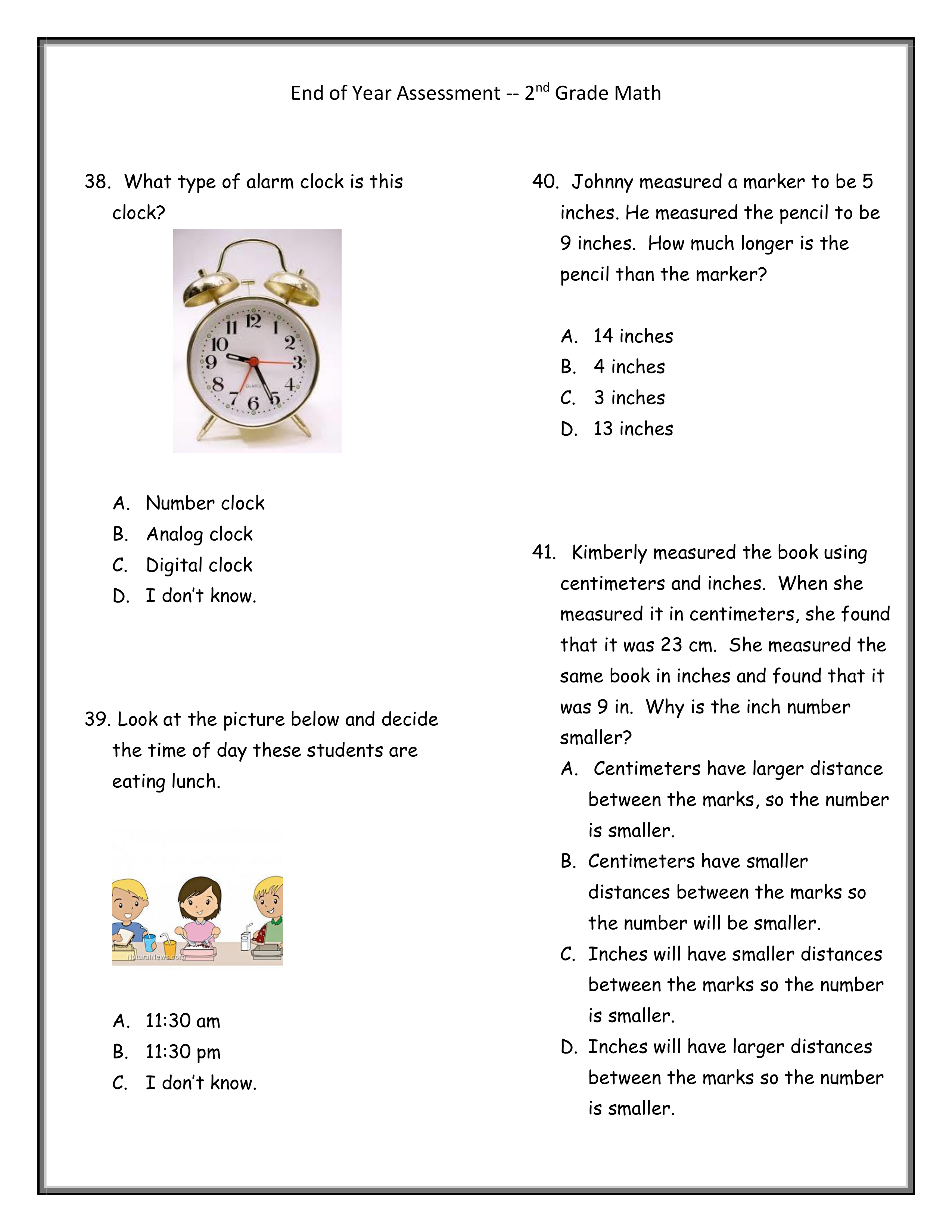 1. Kimberly measured the book using centimeters and inches. When she measured it in centimeters, she found that it was 23 cm. She measured the same book in inches and found that it was 9 in. Why is the inch number smaller?