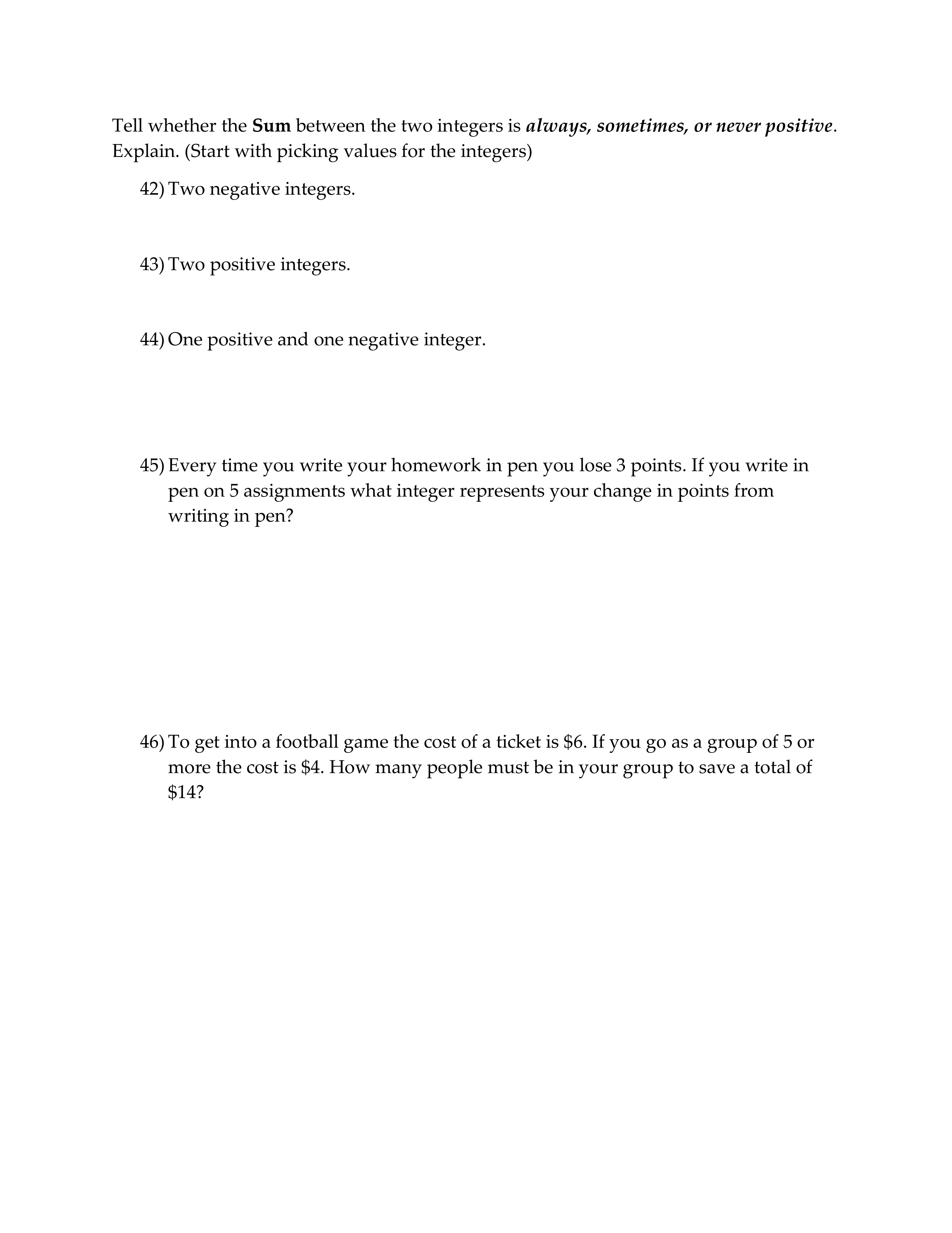 The sum between two negative integers is _______ positive.
