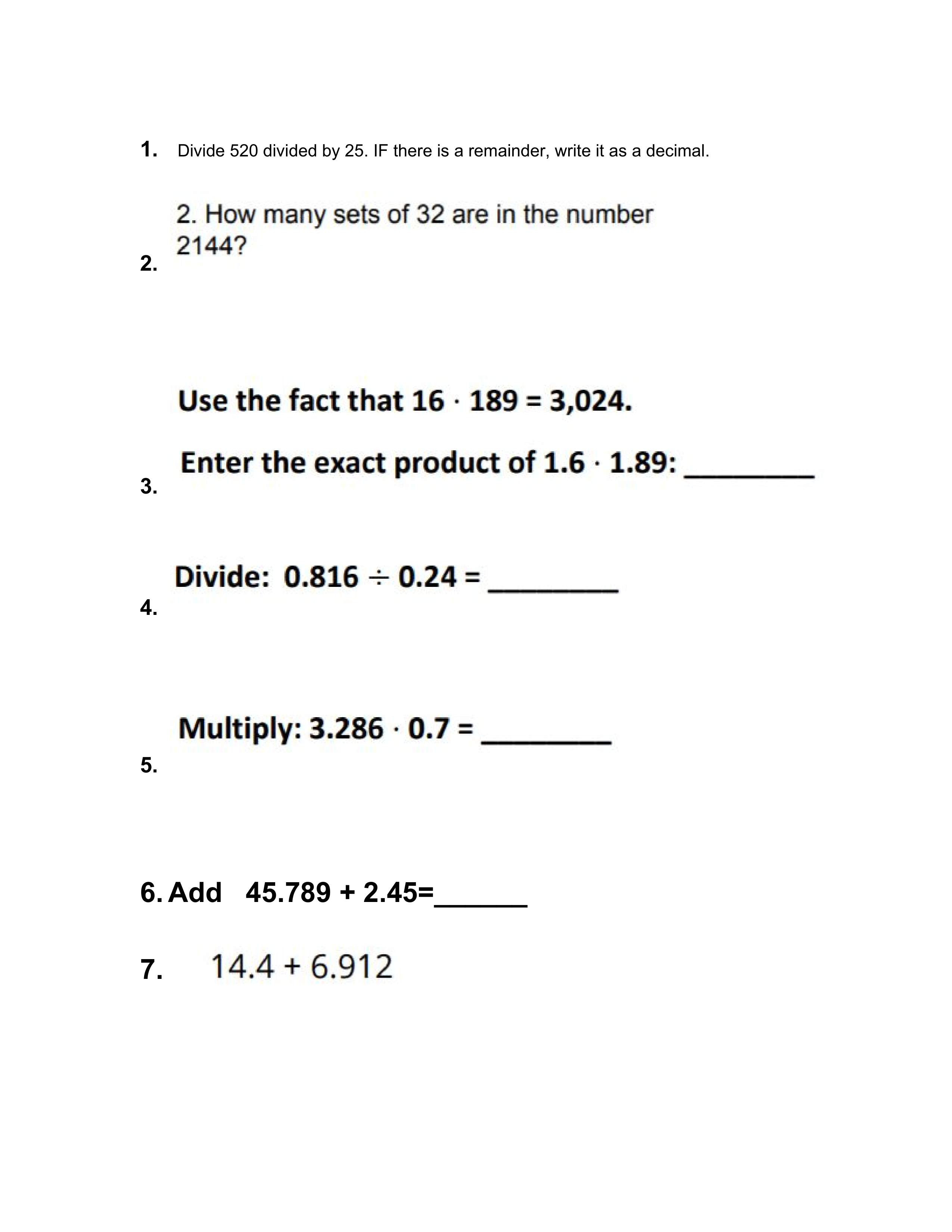 See number two(in blue) on the document. If you just put an answer without showing your work, your answer will be marked incorrect. Consider taking a picture of this problem and uploading. Use the square with the mountains in it to upload an image.Write the remainder as a decimal.