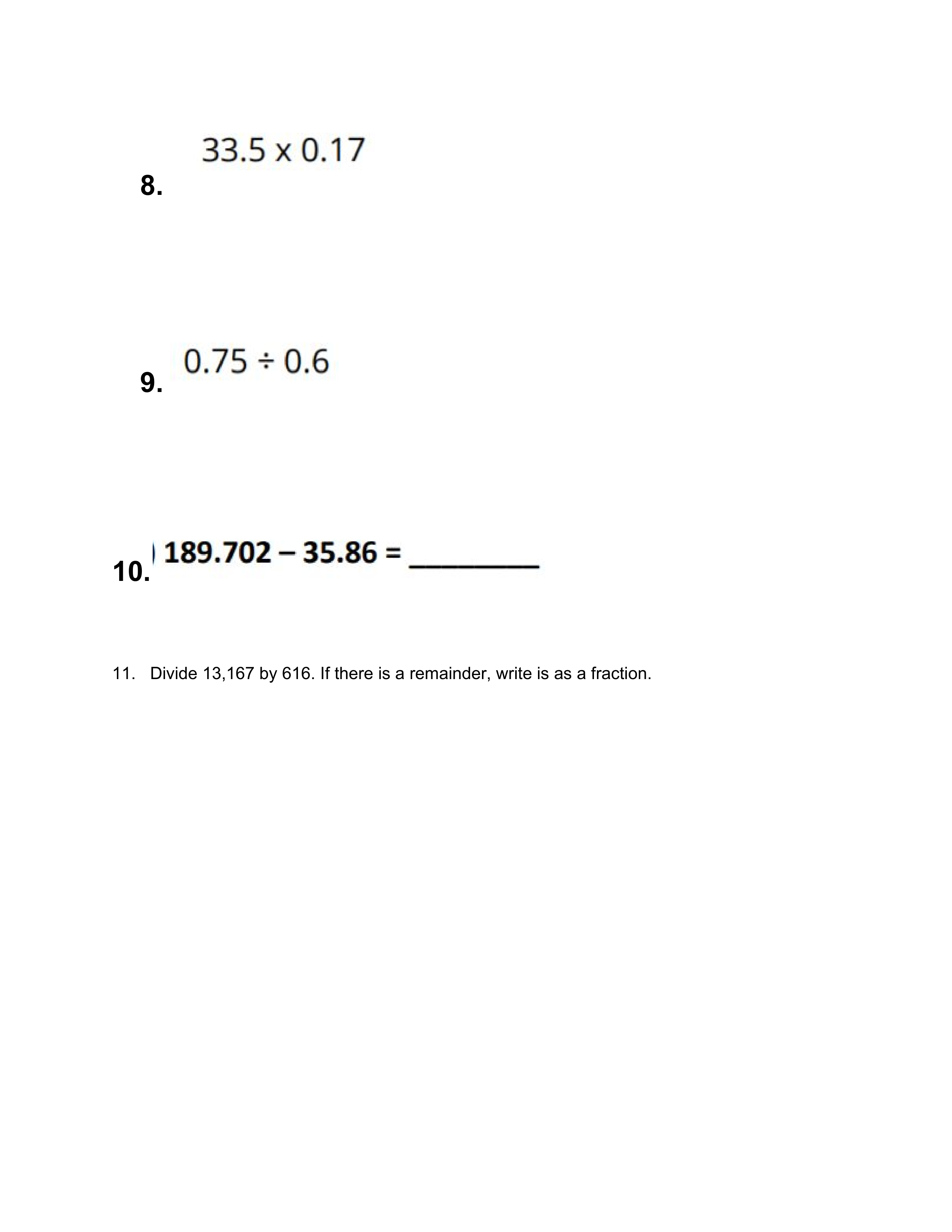 See #12 ( in blue) on the document. You must show your work to get credit. Upload an image of your written work or redo ALL of it using the text box on the left or by using the scribble line and your mouse.Divide 13,167 by 616. If there is a remainder, write it as a fraction.