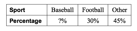 The table shows the percentage of total athletes at a school that play certain sports. Each athlete only plays one sport. Twenty athletes play baseball.