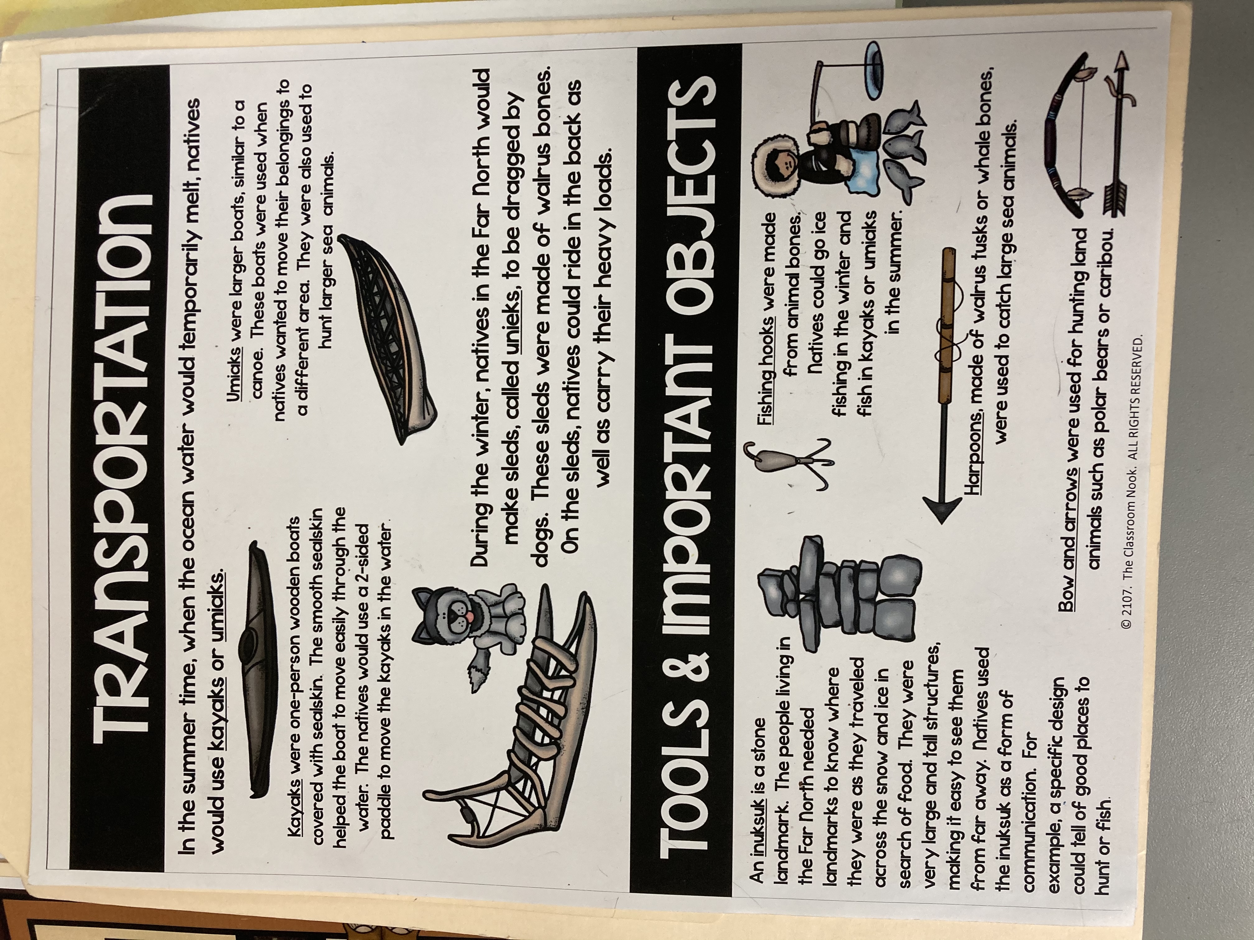 fishing hooks | arrow_right_alt | made of walrus tusks or whale bones, used to catch large sea animals |