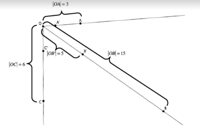 dilation(C) = C′. |OA| = 3, |OB| = 15, |OC| = 6, and |OB′| = 5 as shown.