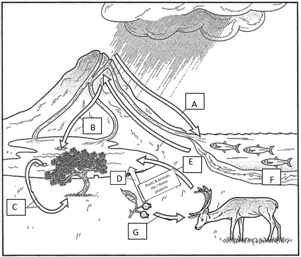 Rocks and soil | arrow_right_alt | Phosphorus is broken down in waste and returned to water or soil |