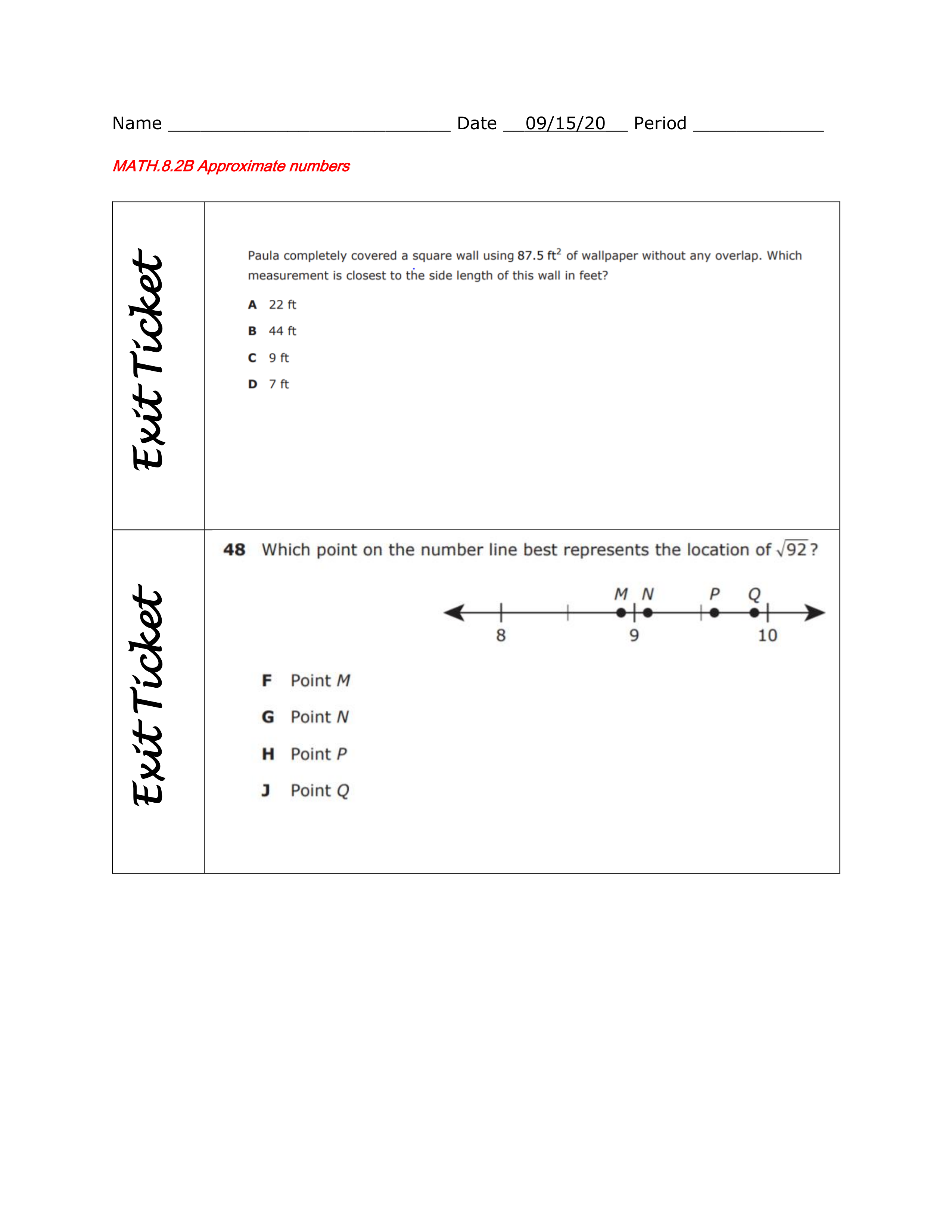 September 15th Exit Ticket 8.2B Approximate Numbers