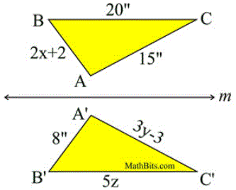 Triangle ABC is reflected in line m. Find the product of of xyz.