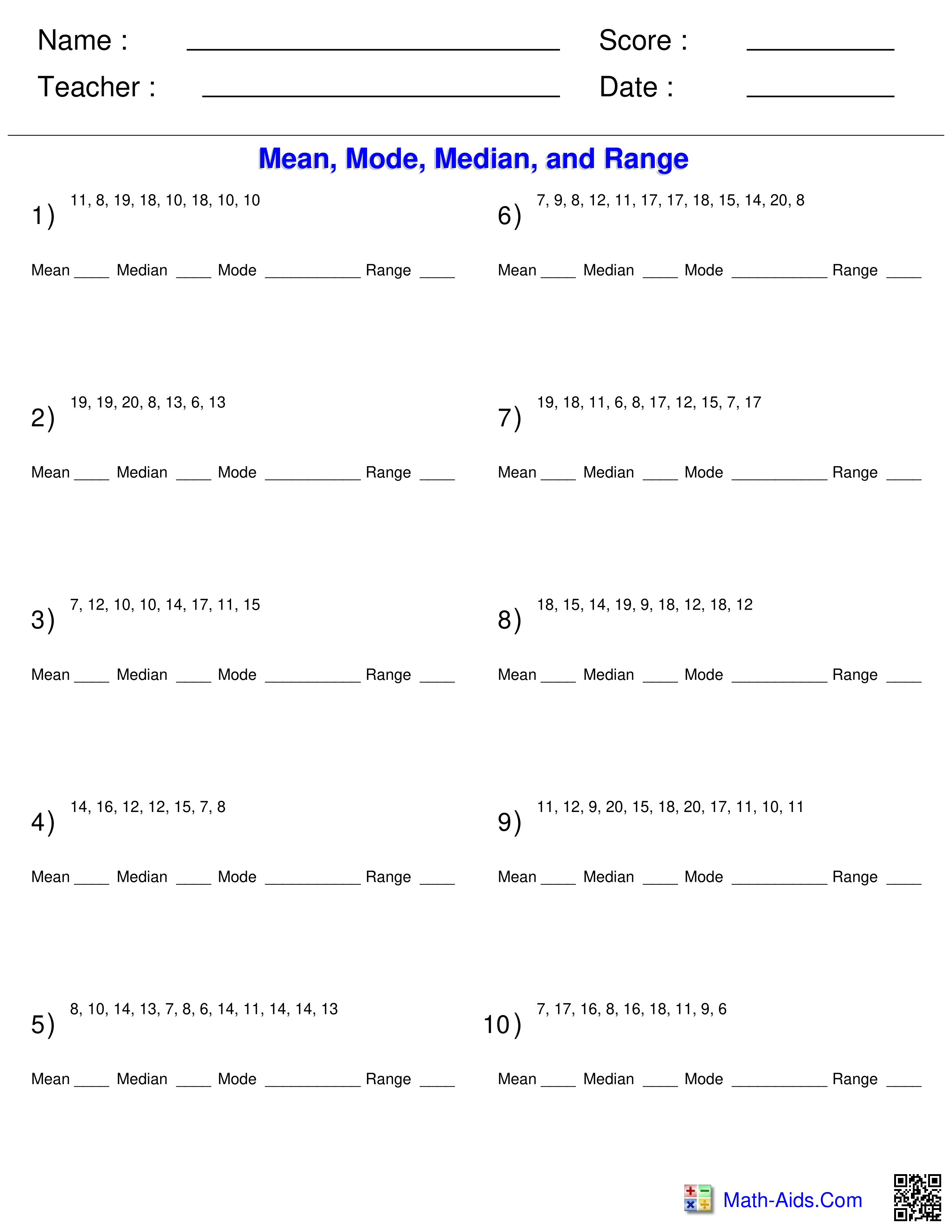 Mean, Median, Mode and Range