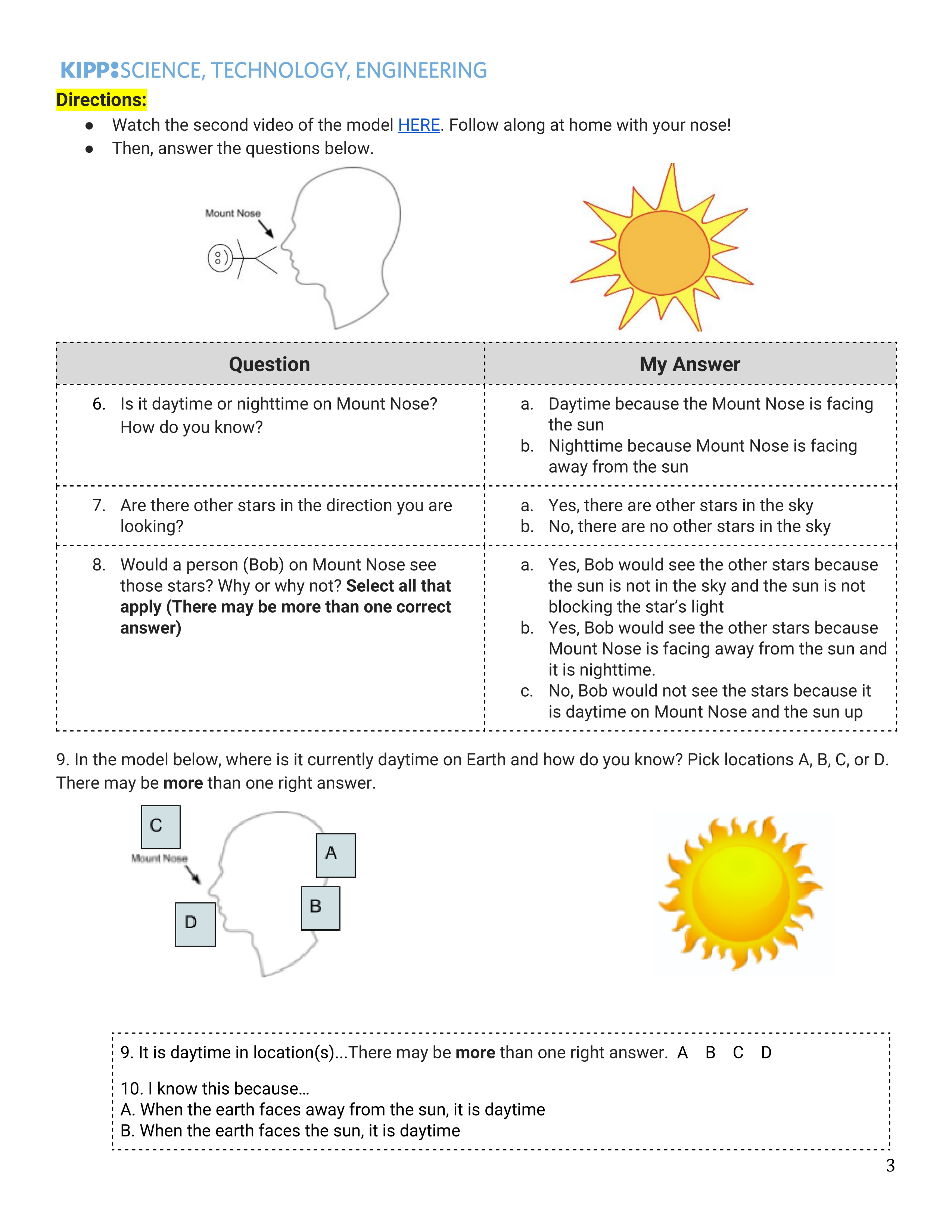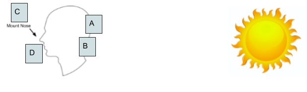 In the model below, where is it currently daytime on Earth and how do you know? Pick locations A, B, C, or D. There may be more than one right answer.
