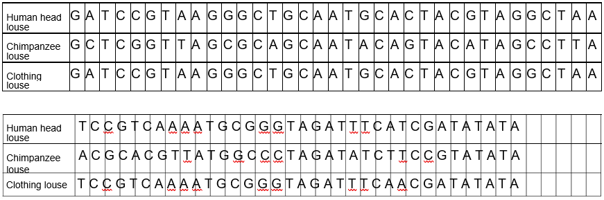 Question 3Calculate the number of base pair mutations that have occurred between the human head louse and the chimpanzee louse. Use this information to determine a molecular clock for how many years it takes for 1 base to mutate. (1 mark)