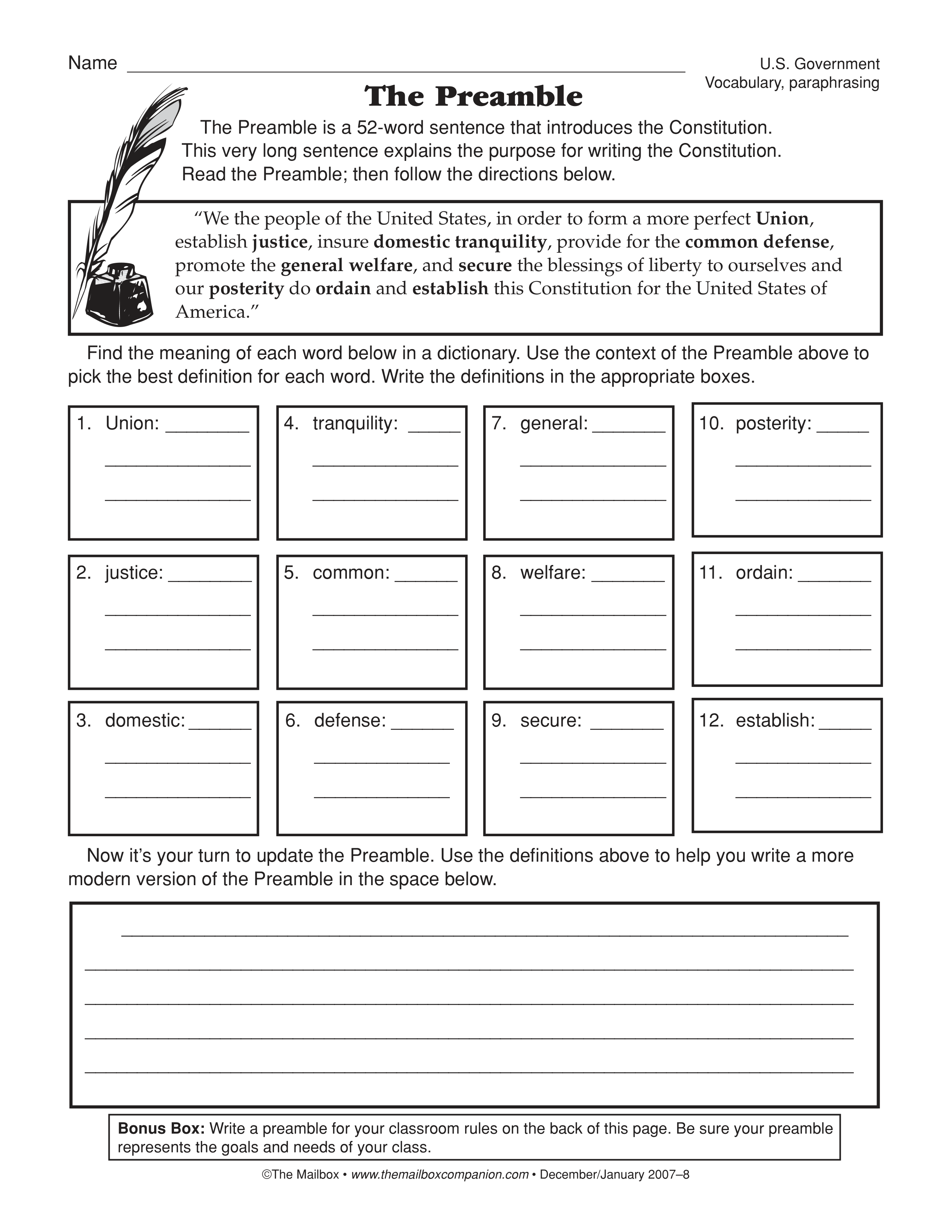 Now it's your turn to update the Preamble. Use the definitions above to help you write a more modern version of the Preamble in the space below.