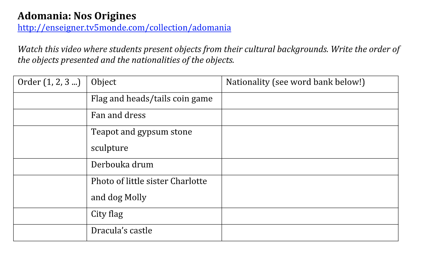 Les nationalités possibles: algérienne, australienne, espagnole, roumain, australien, anglais, français, française, anglaise, espagnol, roumaine, algérien