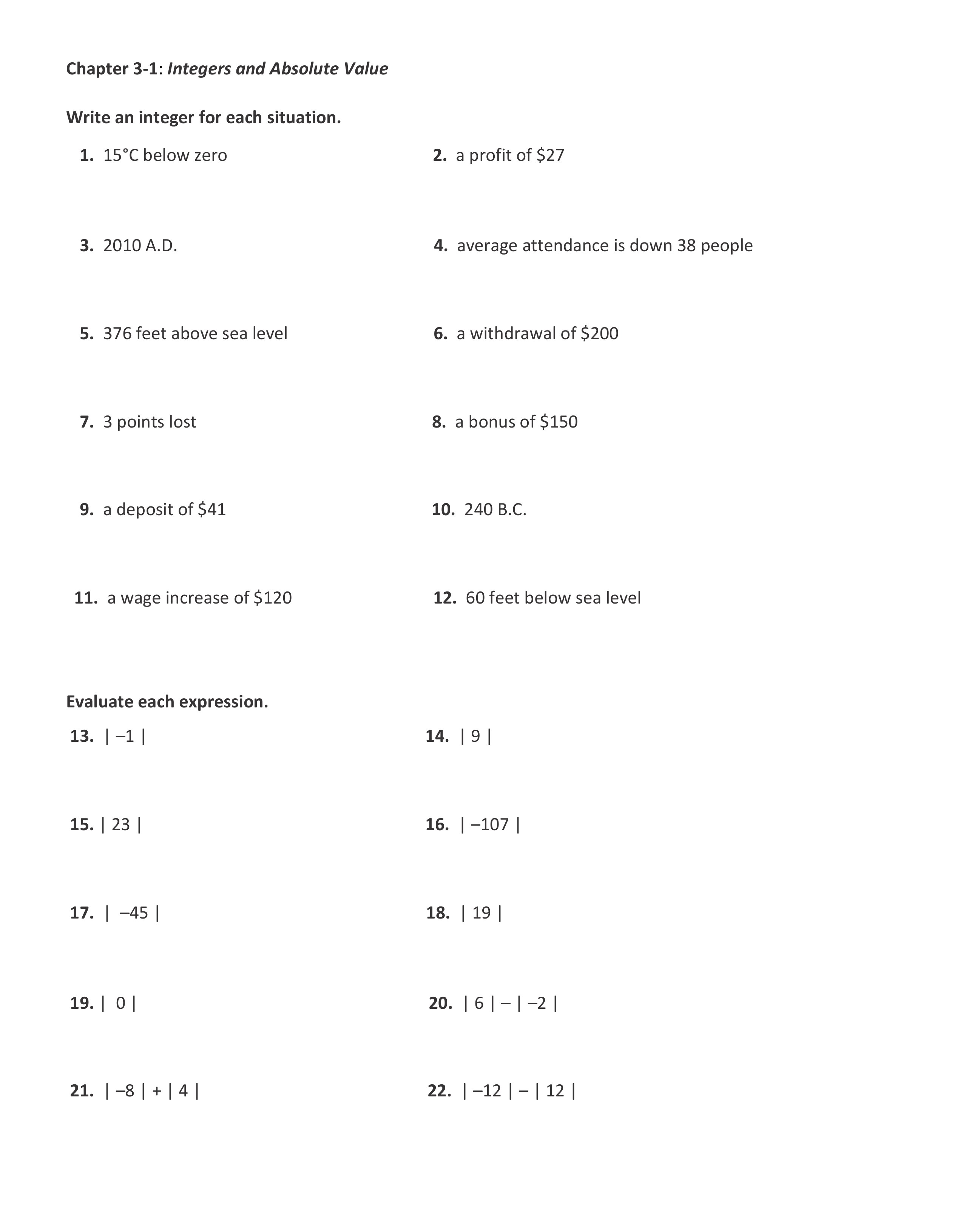 Chapter 3-1: Integers and Absolute Value