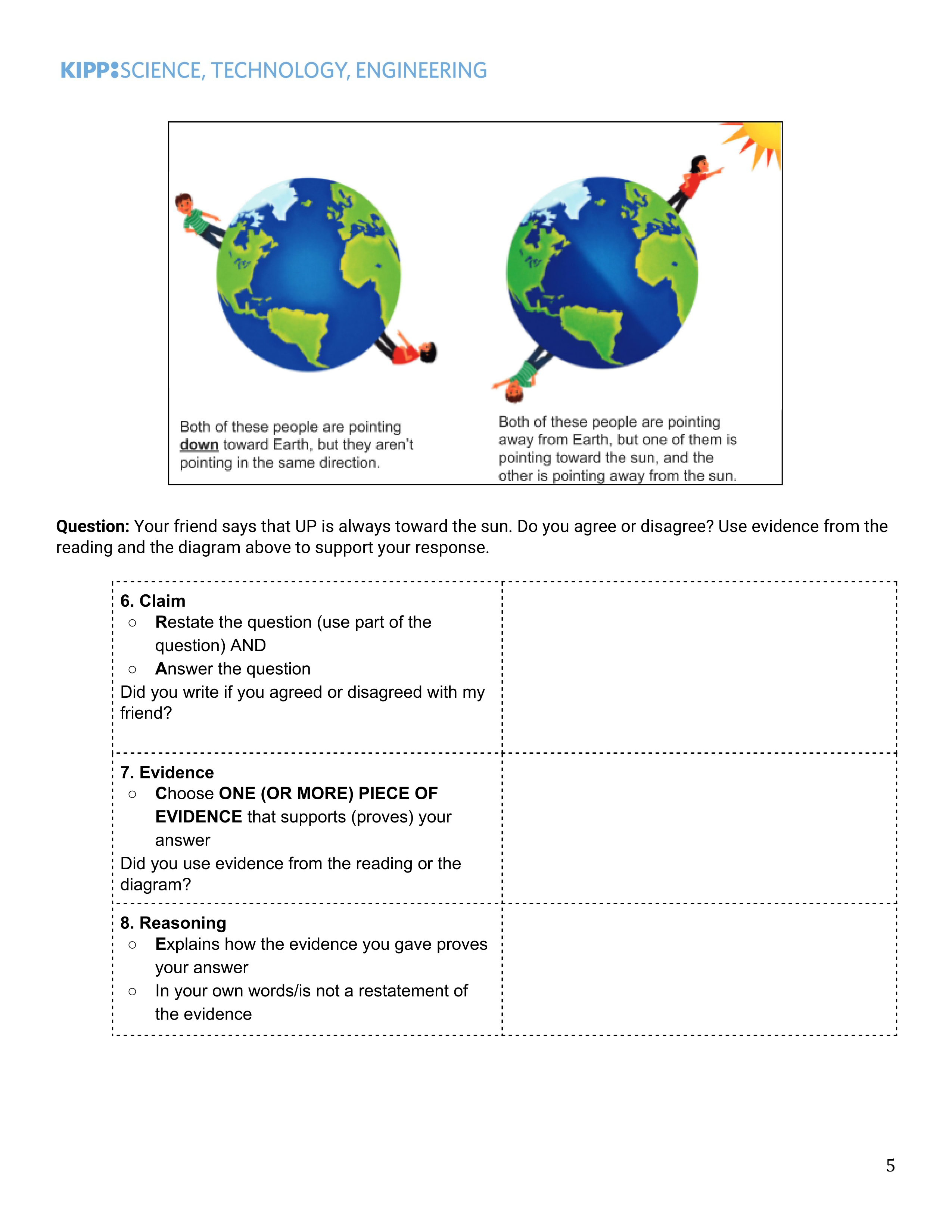 Question: Your friend says that UP is always toward the sun. Do you agree or disagree? Use evidence from the reading and the diagram above to support your response.