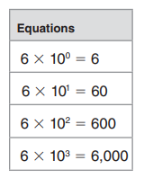 The table shows the equations Ms. Iussig discussed in math class today. Explain the patterns of zeros in the product when multiplying by powers of 10.