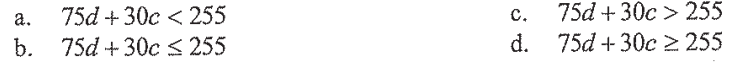 each DVD player (d) and a $30 profit on the sale of each cordless telephone (c). The store wants to make a profit of at least $255.00 from its sales of DVD players and cordless phones. Which inequality describes this situation?