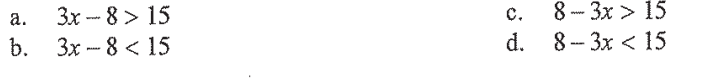 Mrs. Smith wrote "Eight less than three times a number is greater than fifteen" on the board. If x represents the number, which inequality is a correct translation of this statement?