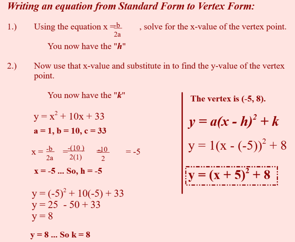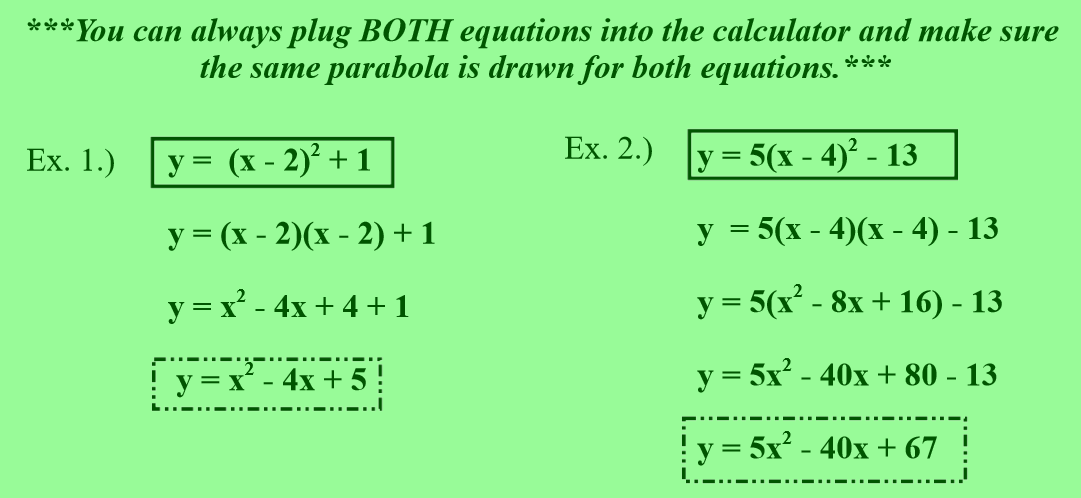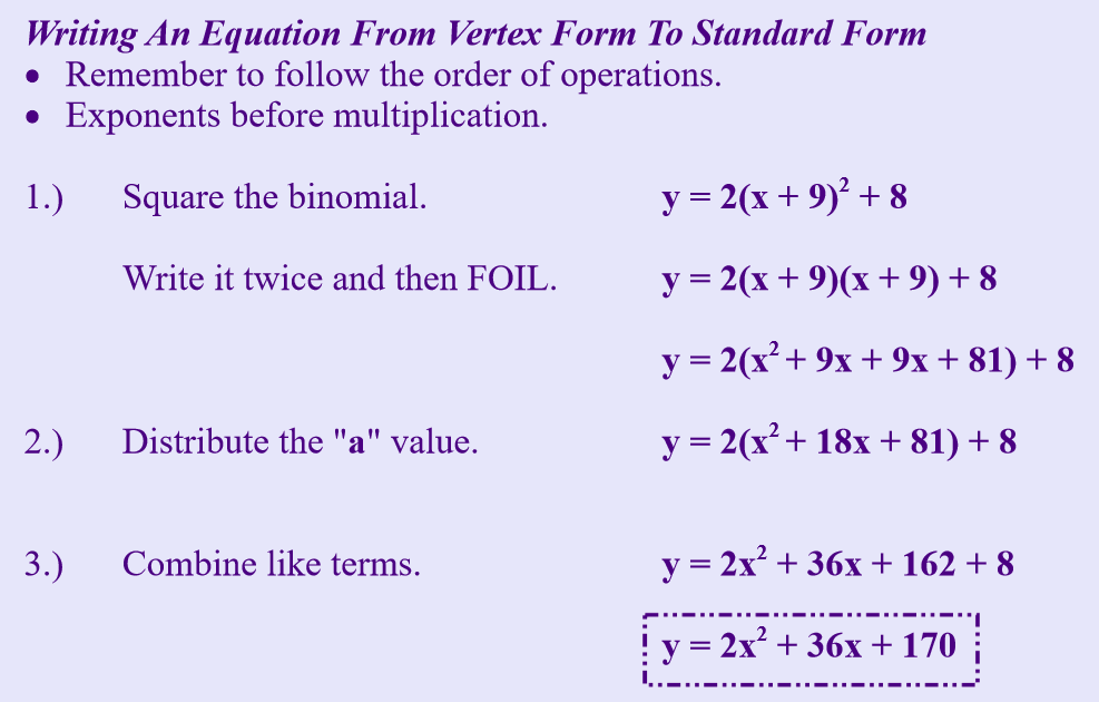 Convert each of the following from vertex form to standard form.Each equation should be in simplest form.