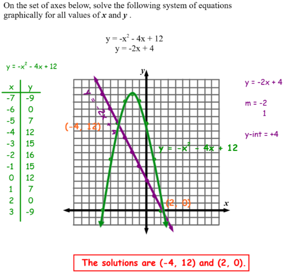 The graphs of the equationsy = x2 + 2x - 8 and -2x + 2y = -4are drawn on the same set of axes.State one of the solutions of the system.