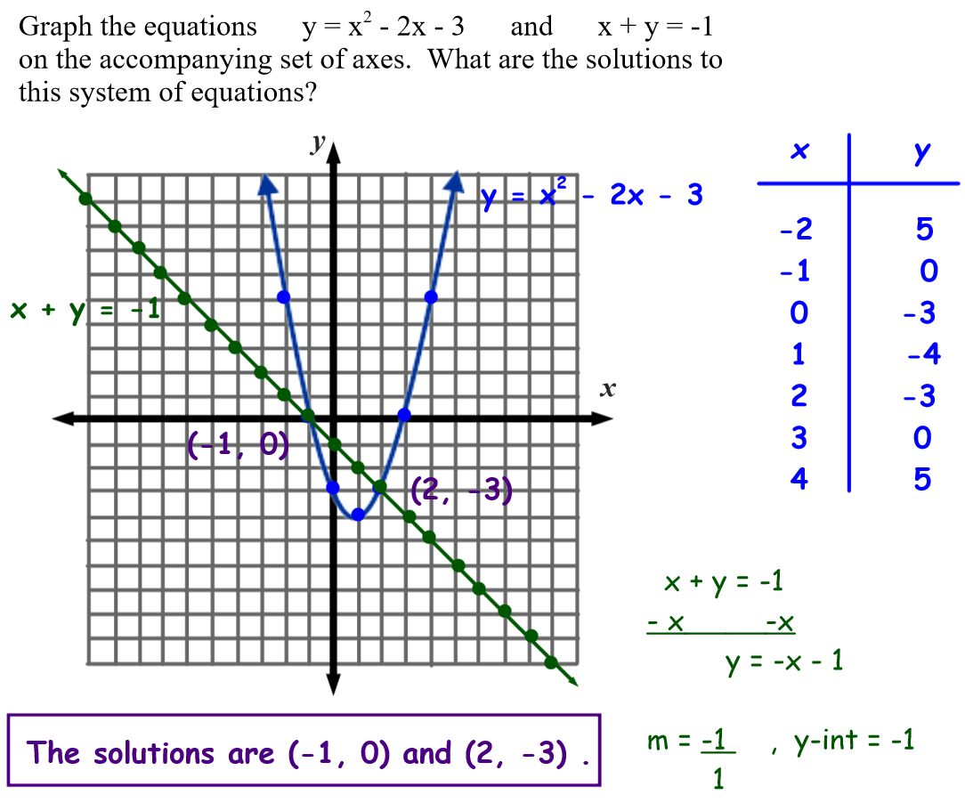 The graphs of the equationsy = x2 - 4x - 1 and y + 3 = -xare drawn on the same set of axes.State one of the solutions of the system.