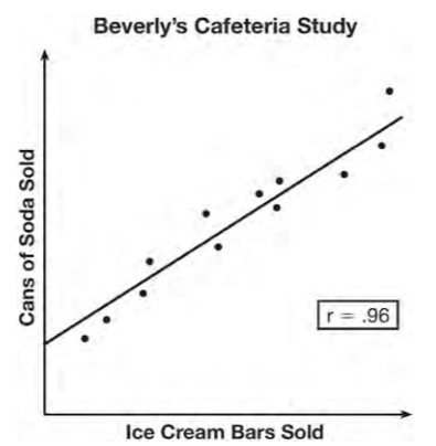 Beverly did a study this past spring using data she collected from a cafeteria. She recorded data weekly for ice cream sales and soda sales. Beverly found the line of best fit and the correlation coefficient, as shown in the diagram below.
