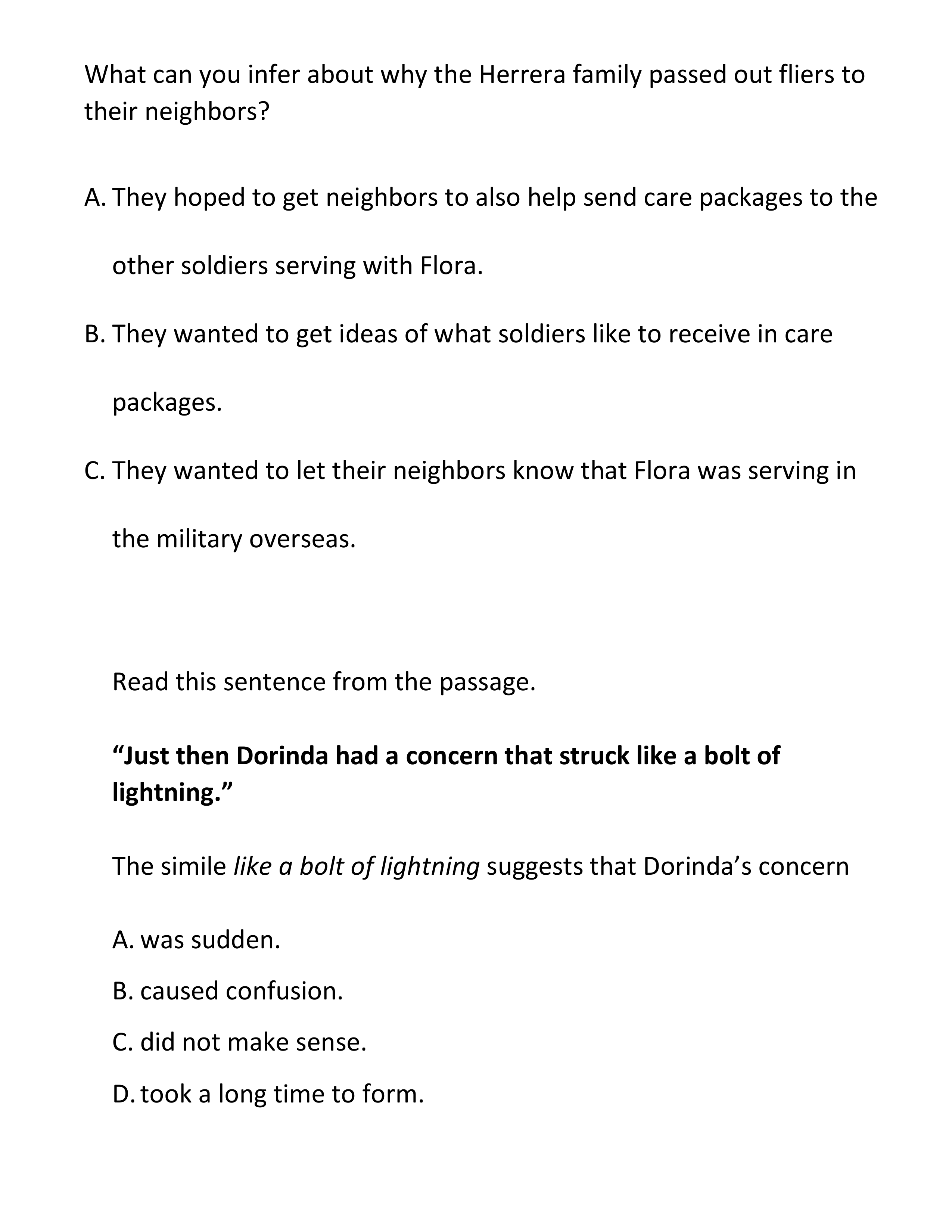 Read this sentence from the passage.“Just then Dorinda had a concern that struck like a bolt of lightning.”The simile like a bolt of lightning suggests that Dorinda’s concern