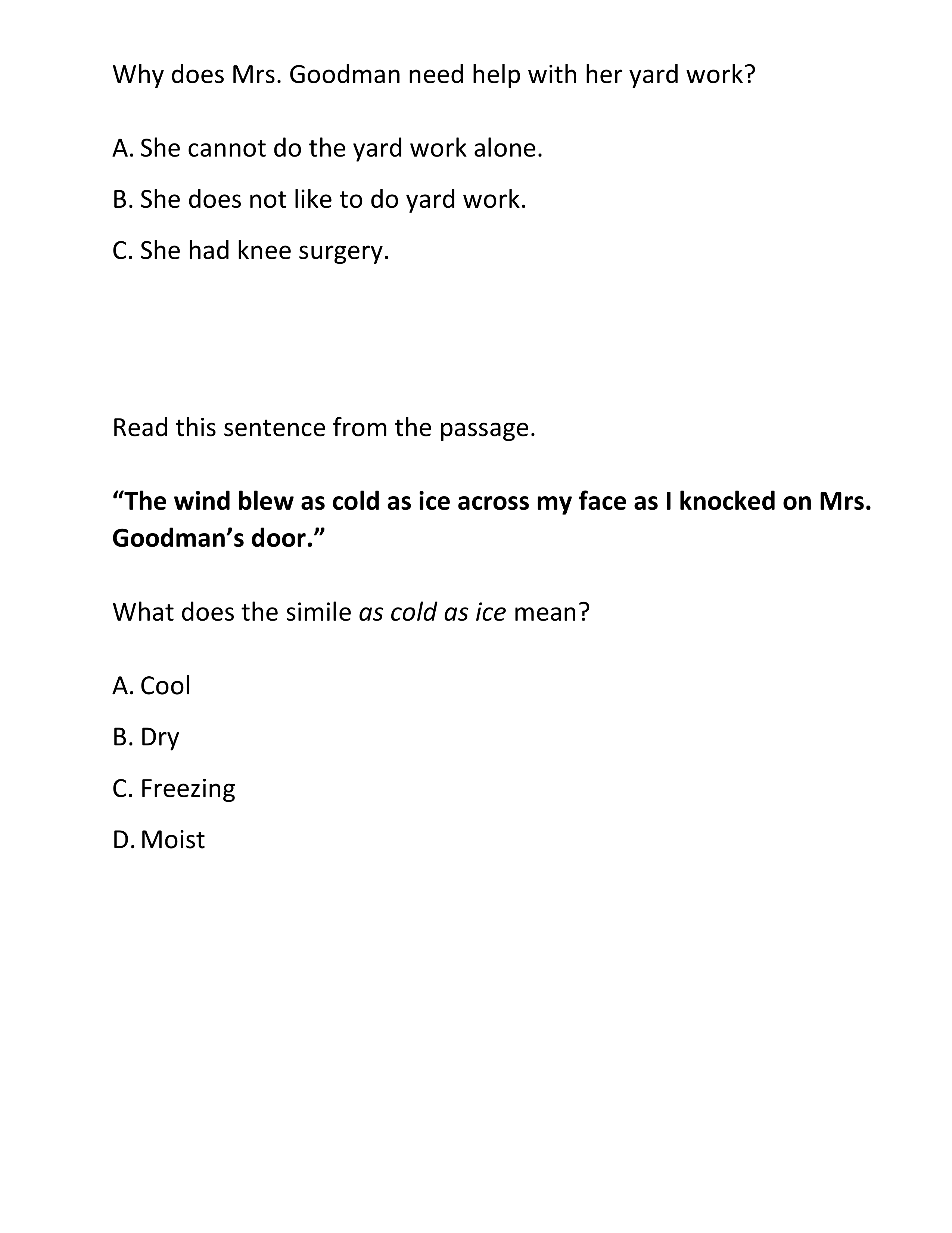 “The wind blew as cold as ice across my face as I knocked on Mrs. Goodman’s door.”