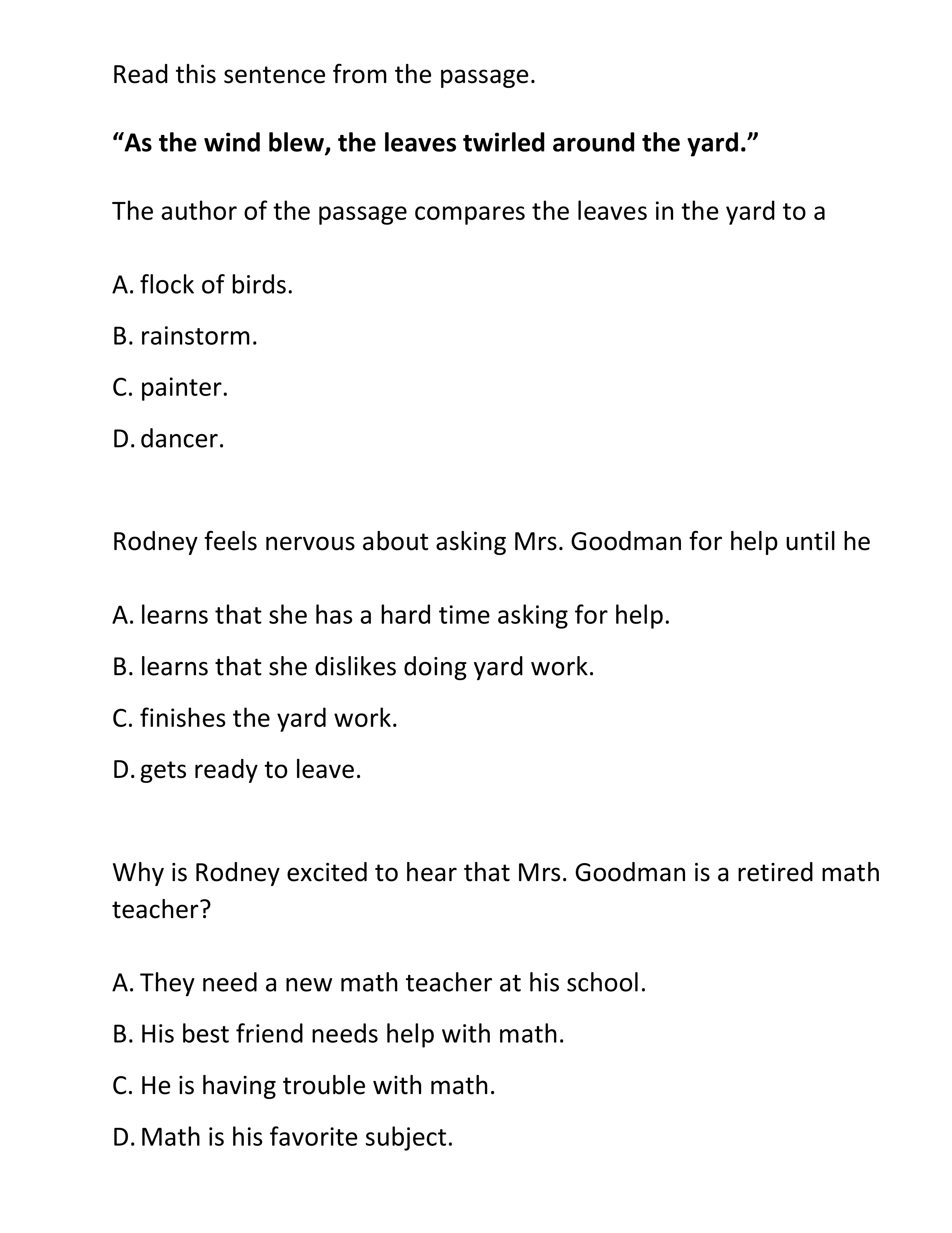 Read this sentence from the passage.“As the wind blew, the leaves twirled around the yard.”The author of the passage compares the leaves in the yard to a