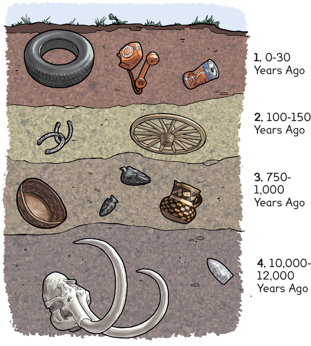Study the picture. It repesents layers of dirt that have been laid down over a period of thousands of years. The objects in each layer are called artifacts. An archaeologist's job is to dig through each layer of dirt and tell the story of the people who lived then by the artifacts they left behind.