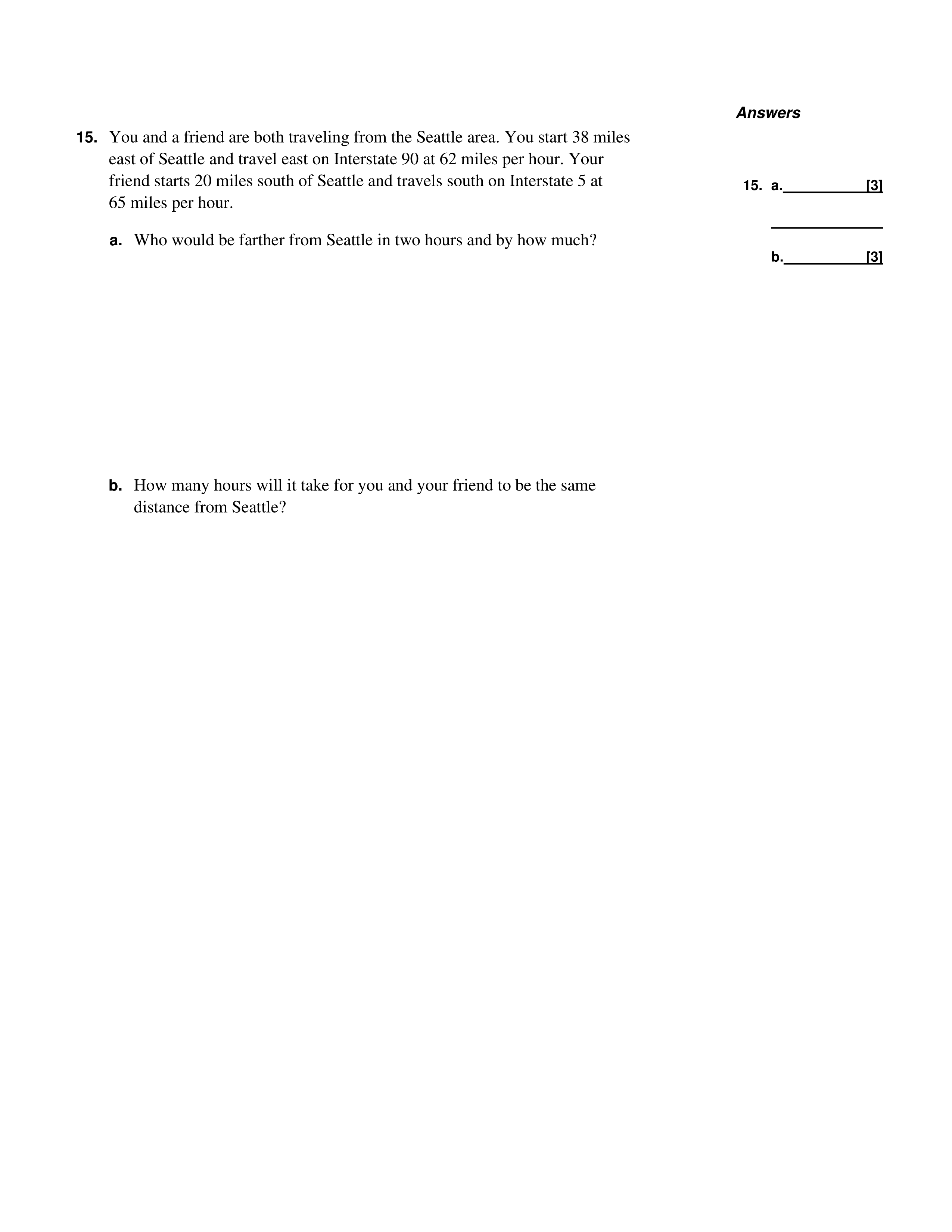 You and a friend are both traveling from the Seattle area. You start 38 miles east of Seattle and travel east on Interstate 90 at 62 miles per hour. Your friend starts 20 miles south of Seattle and travels south on Interstate 5 at 65 miles per hour.
