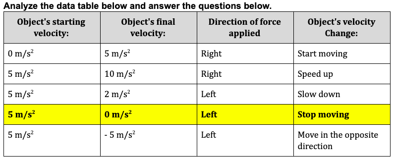 Complete the table below identifying how you made the objects change velocities. Use the key below to help you fill in the chart.
