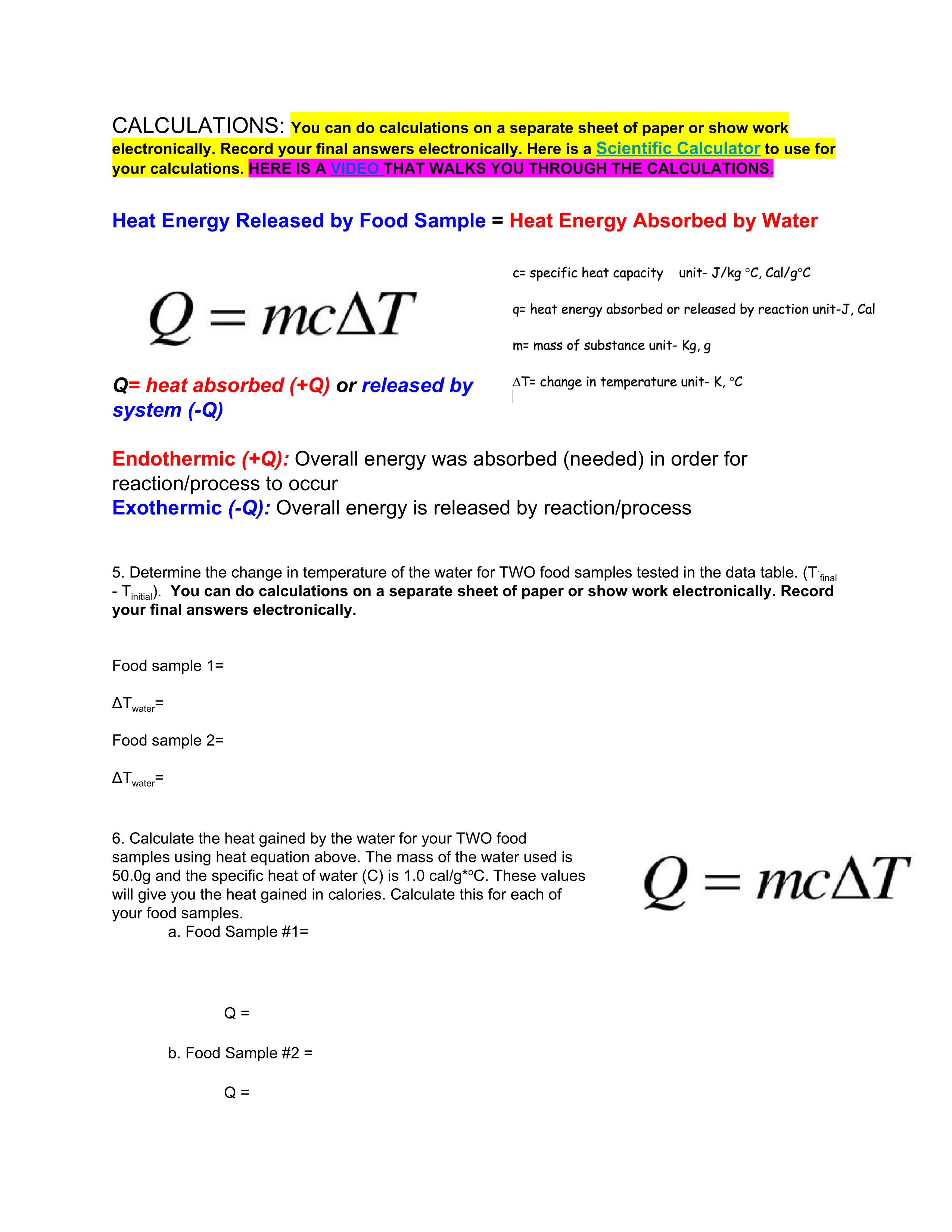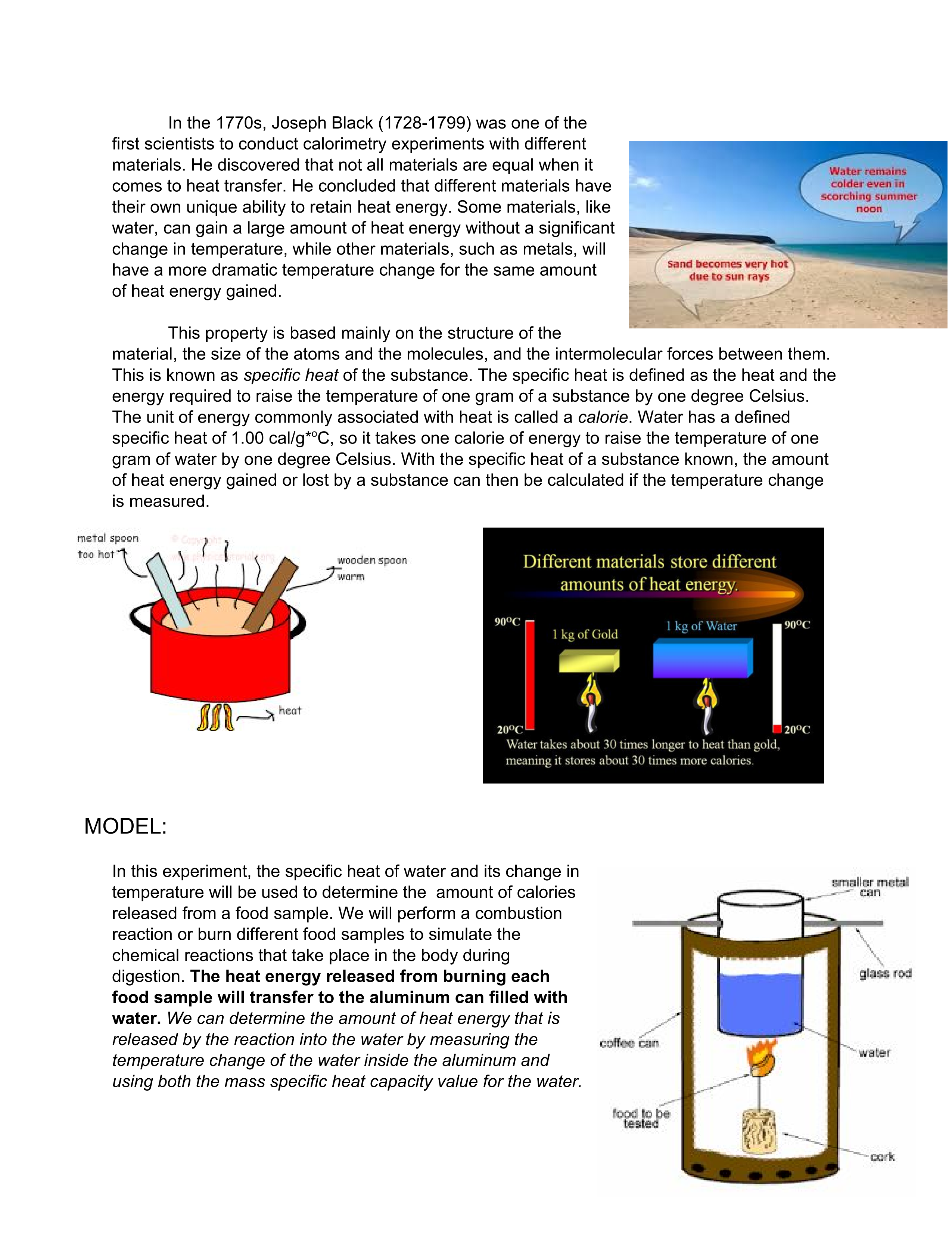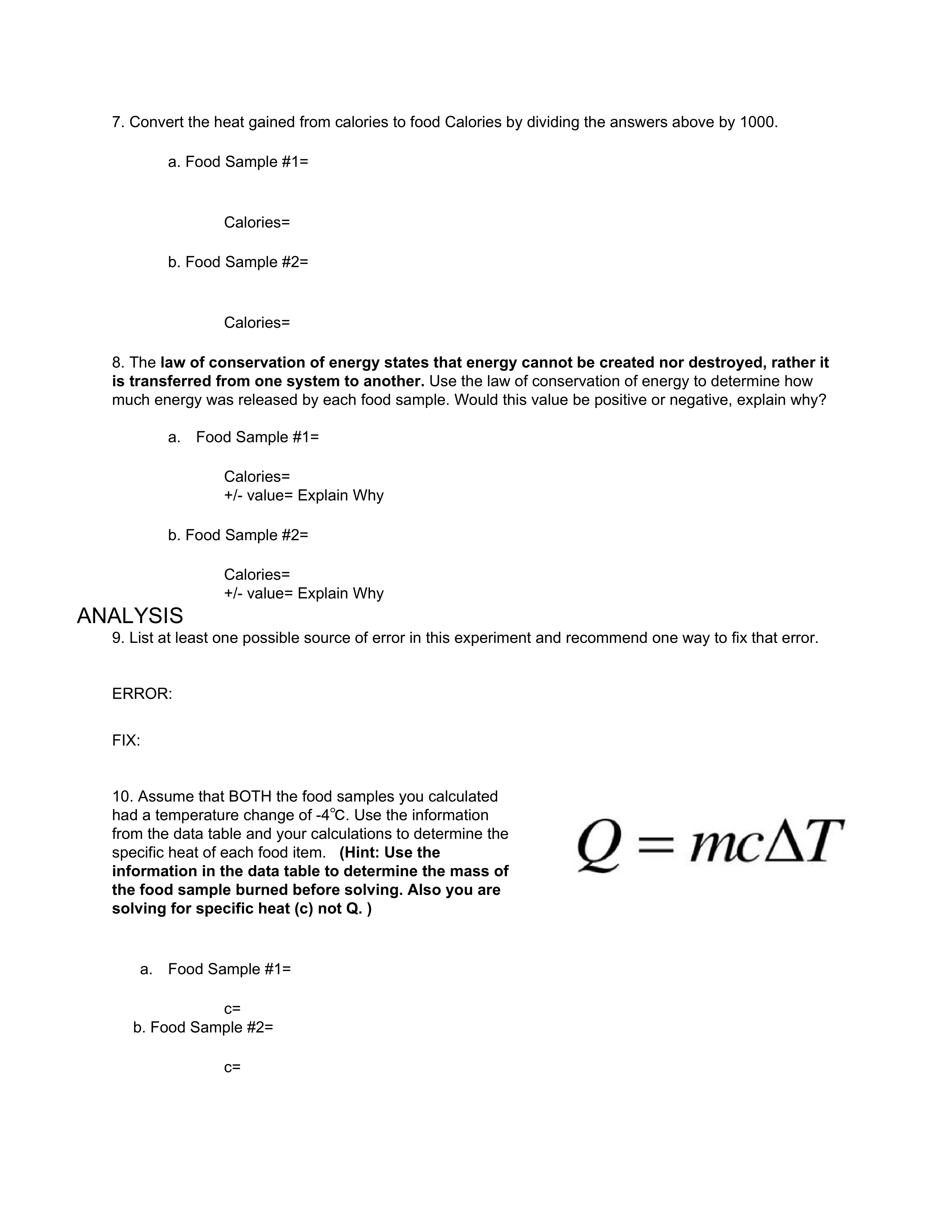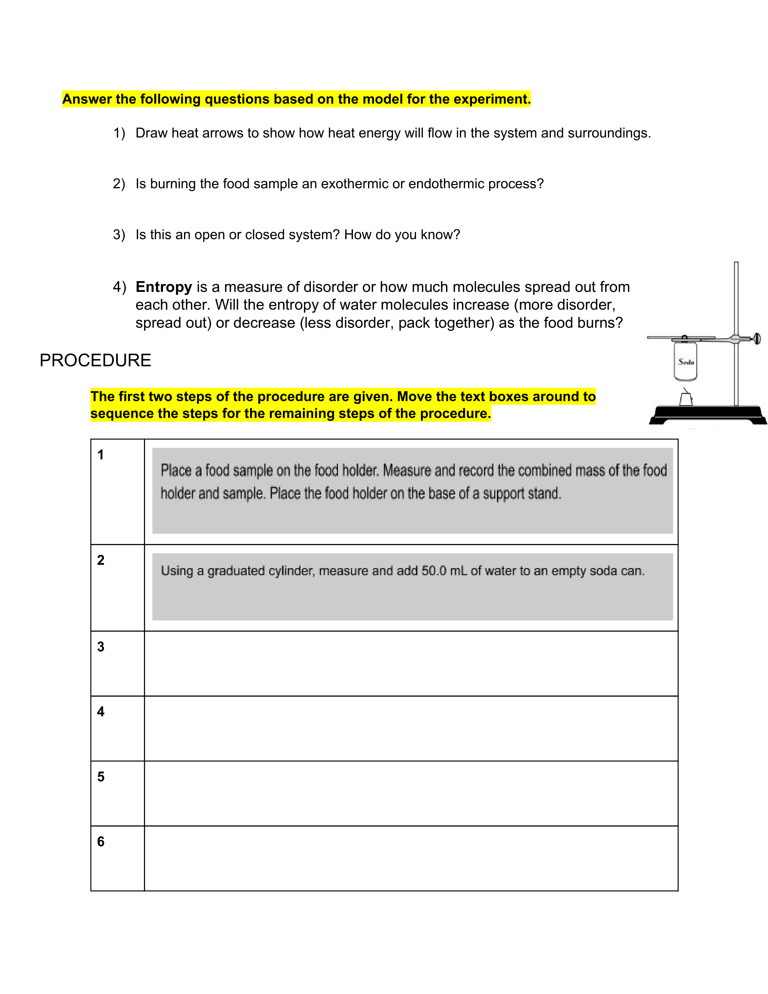 - Light the food sample and center it under the soda can. Allow the water to be heated until the food sample stops burning. Record the maximum (final) temperature of the water in the can.