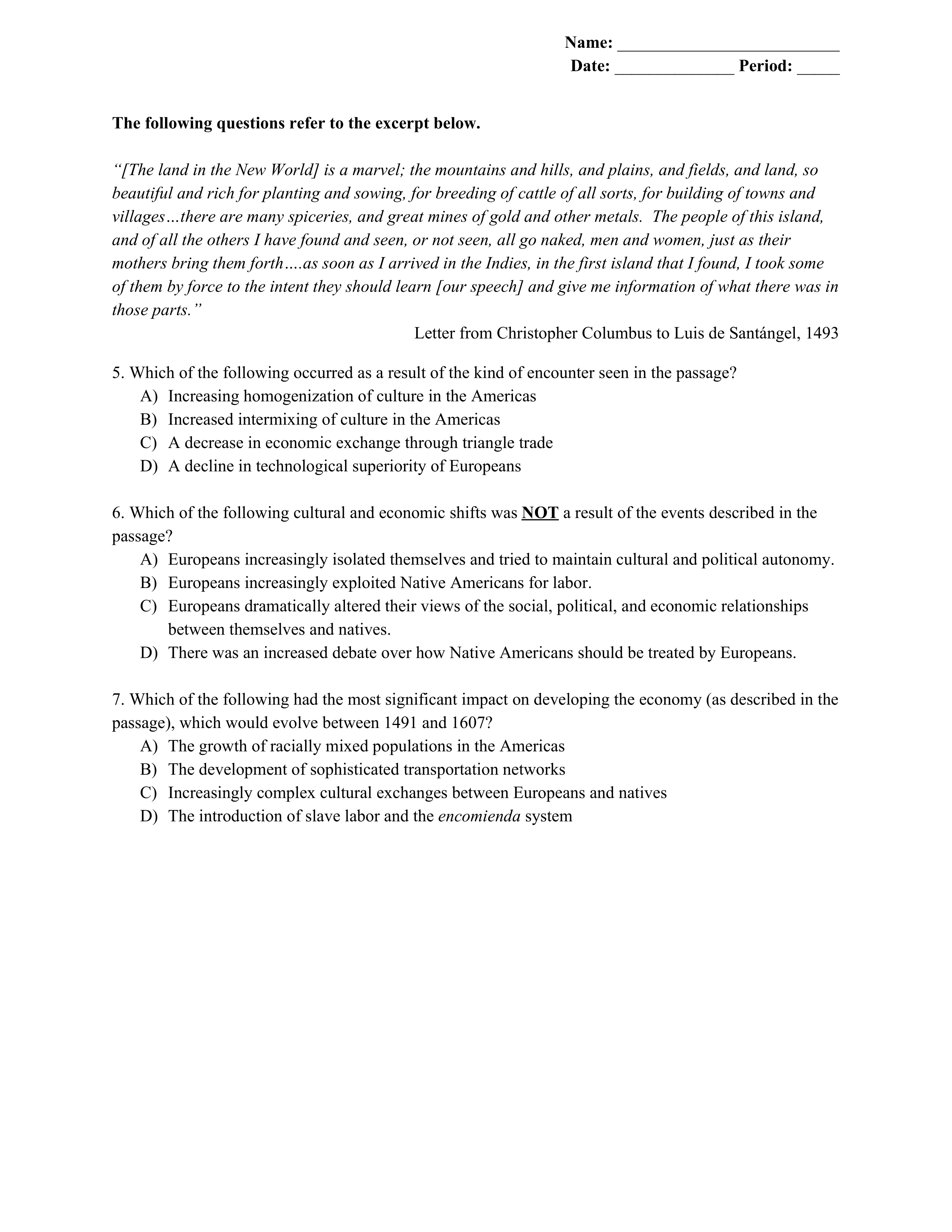 8. Spanish expansion described in the excerpt contributed most directly to which of the following trends?