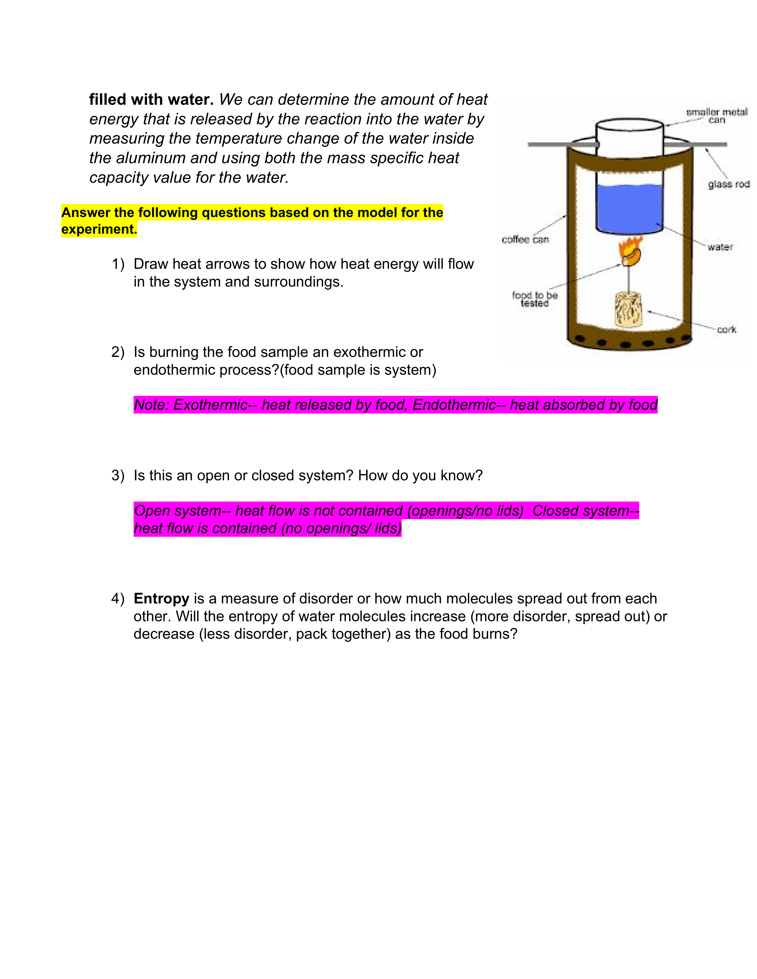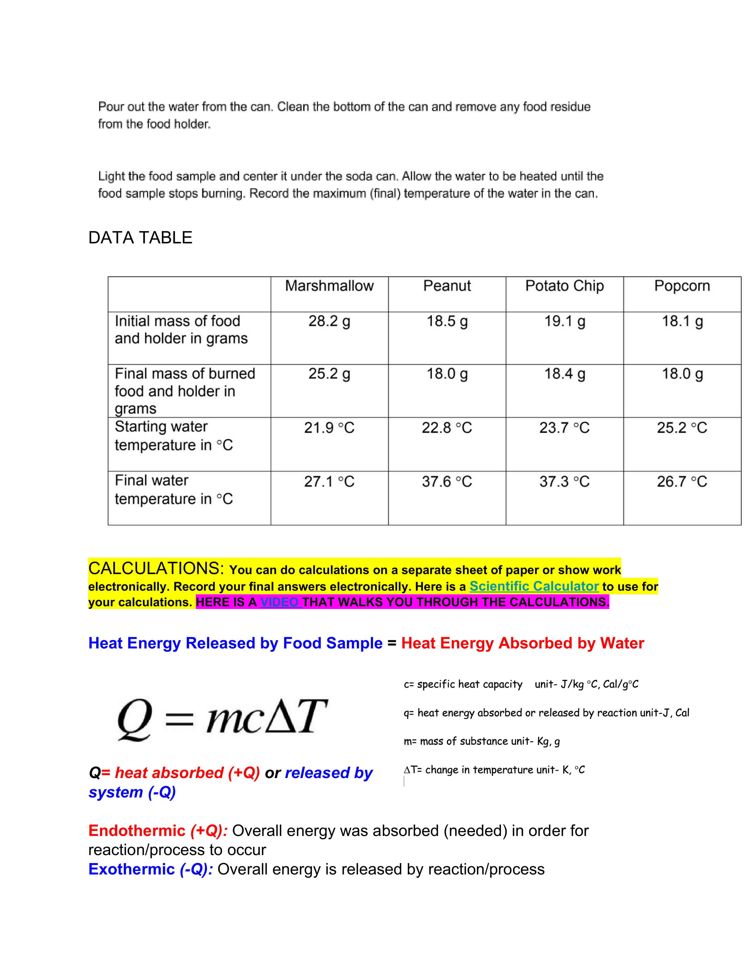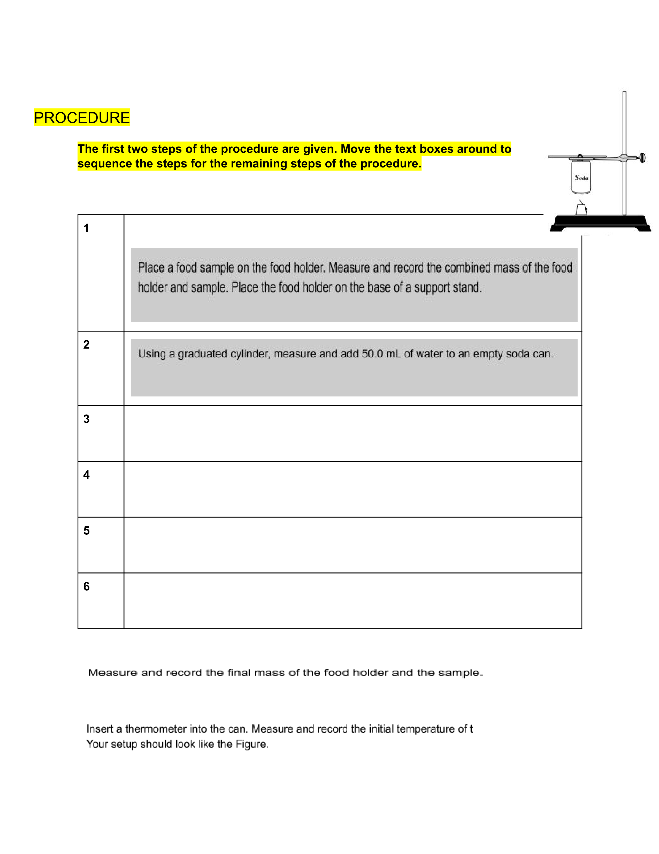 - Light the food sample and center it under the soda can. Allow the water to be heated until the food sample stops burning. Record the maximum (final) temperature of the water in the can.