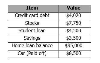 Harold has a car worth $18,200. He has $525 in cash, and $2,800 in his savings account. His only debt is a loan for a car.