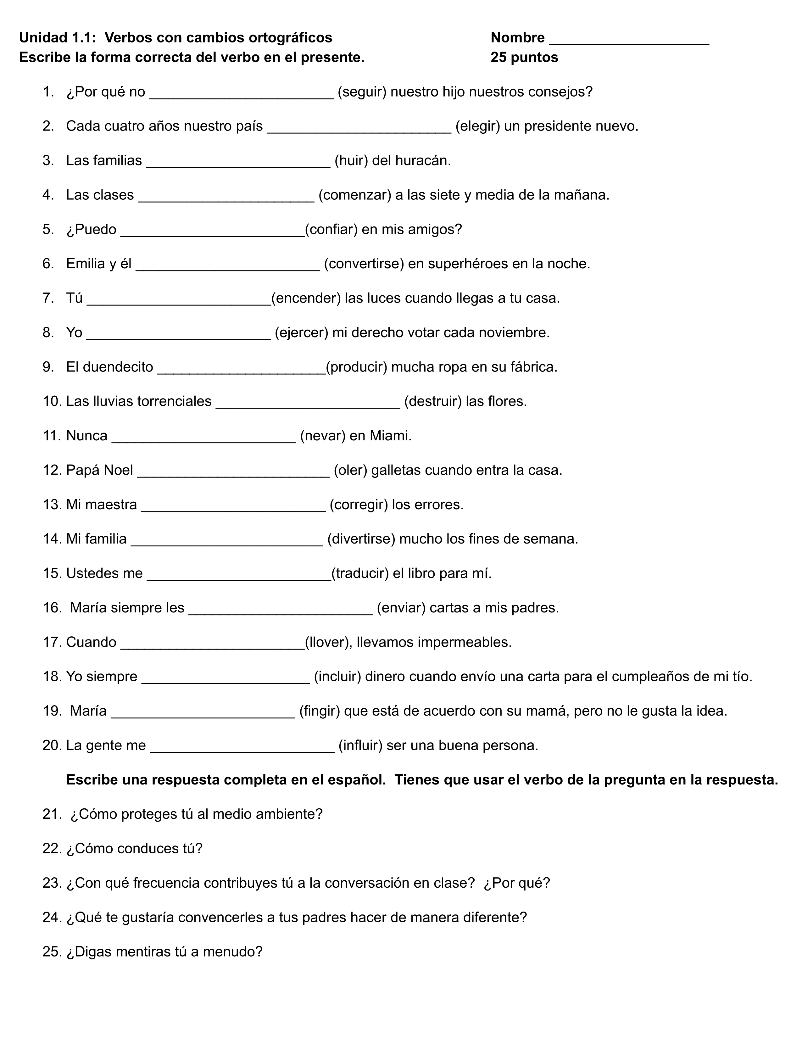 Contesta preguntas 21 - 25. Escribe una oración para contestar cada pregunta. Es necesario usar un verbo de la pregunta en tu respuesta.