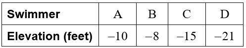 The table shows the elevation of four swimmers. Which swimmer dives down the farthest?