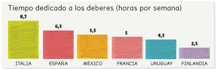 En Italia los niños tienen más/menos/bastantes deberes que en Urugay.