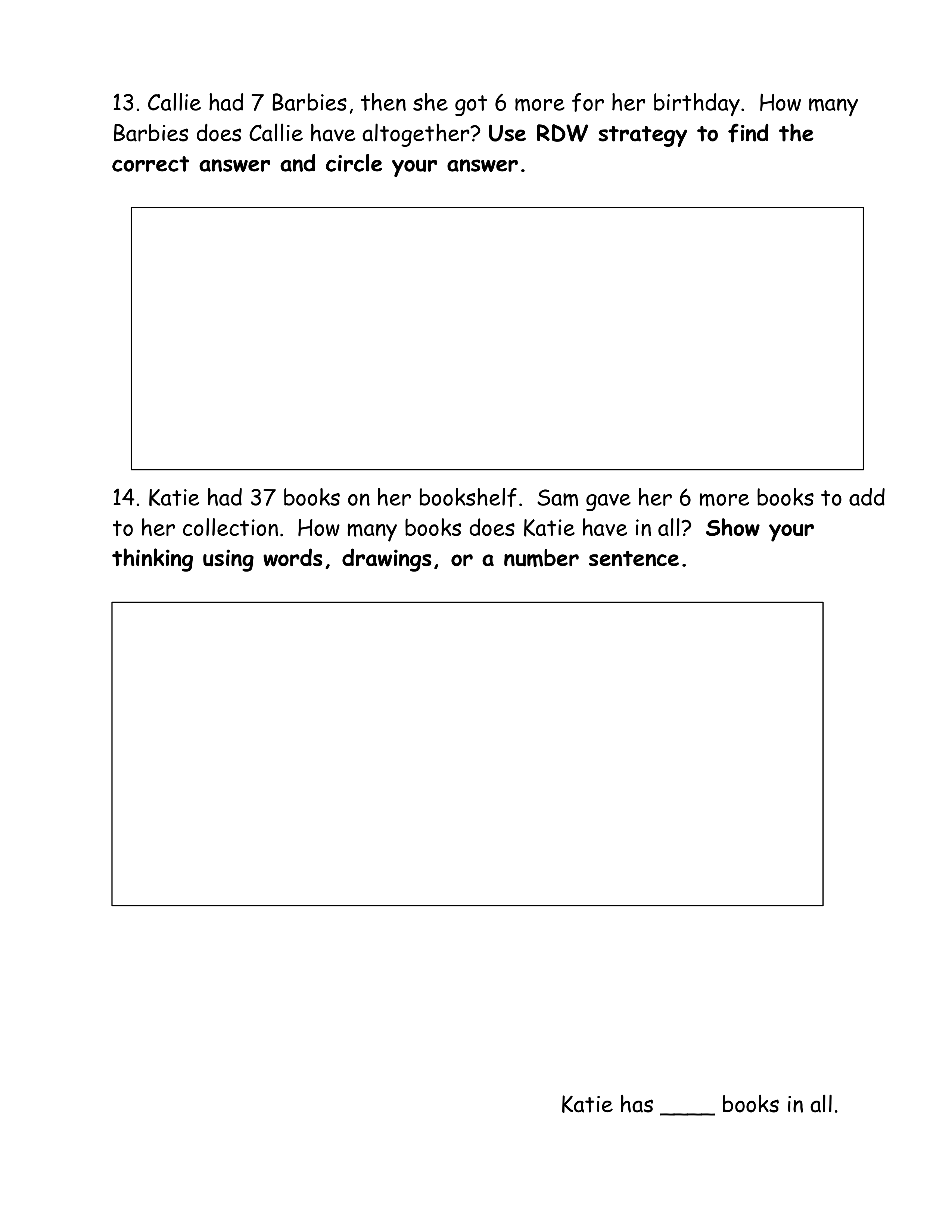 Callies had 7 Barbies, then she got 6 more for her birthday. How many Barbies does Callie have altogether? Use RDW strategy to find the correct answer.