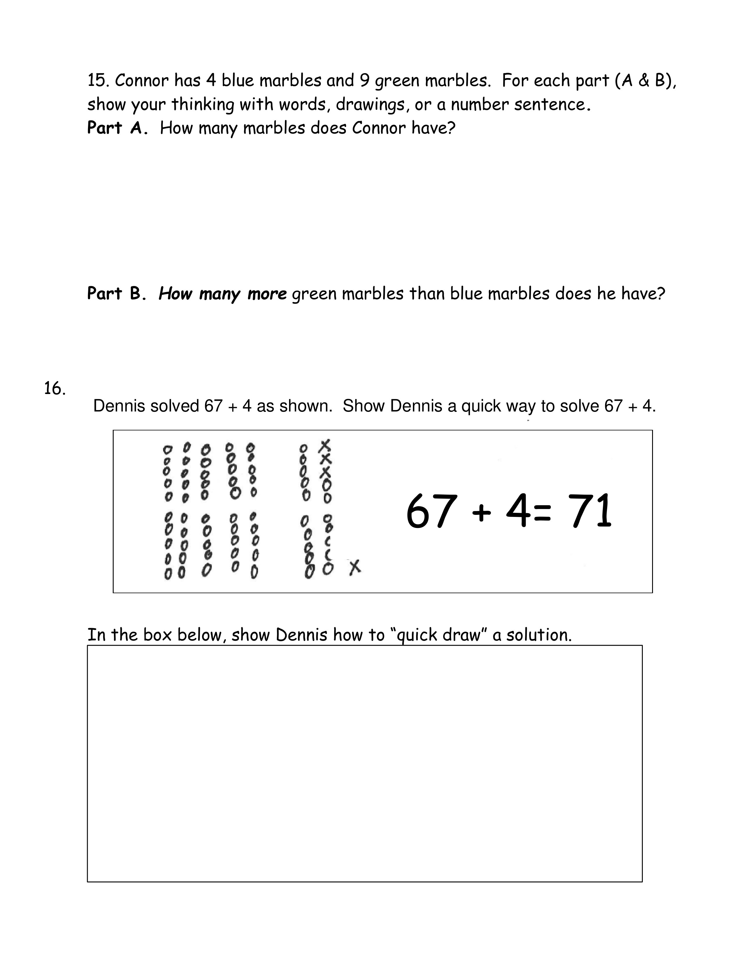 Connor has 4 blue marbles and 9 green marbles. For both parts (A & B) show your thinking with words, drawings, or a number sentence. How many marbles does Connor have? How many more green marbles than blue marbles does Connor have?