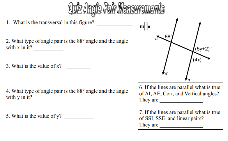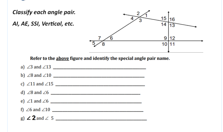 Classify each angle pair as:A Alternate InteriorB Alternate ExteriorC Same Side InteriorD VerticalE Same Side ExteriorF Linear Pair