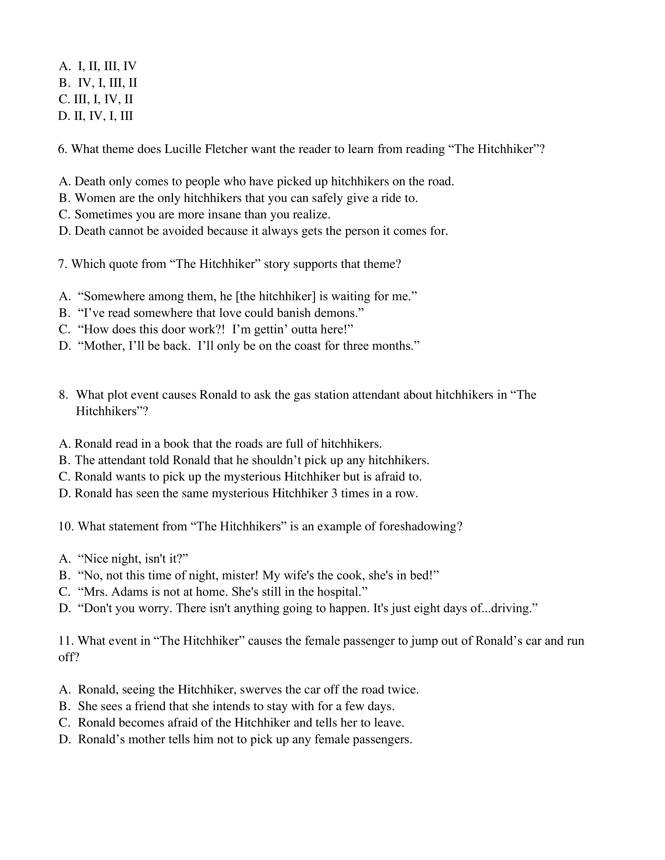 Put these events from “The Hitchhiker” in the order they occurred in the story.I. The storekeeper threatens to call the sheriff if Ronald doesn’t leave immediately. II.Ronald hears that he died 6 days earlier in an accident on the Brooklyn Bridge.III.Ronald sees the Hitchhiker on the Brooklyn Bridge and swerves to avoid hitting him. IV.The female hitchhiker fearfully runs away from Ronald after he almost kills them.