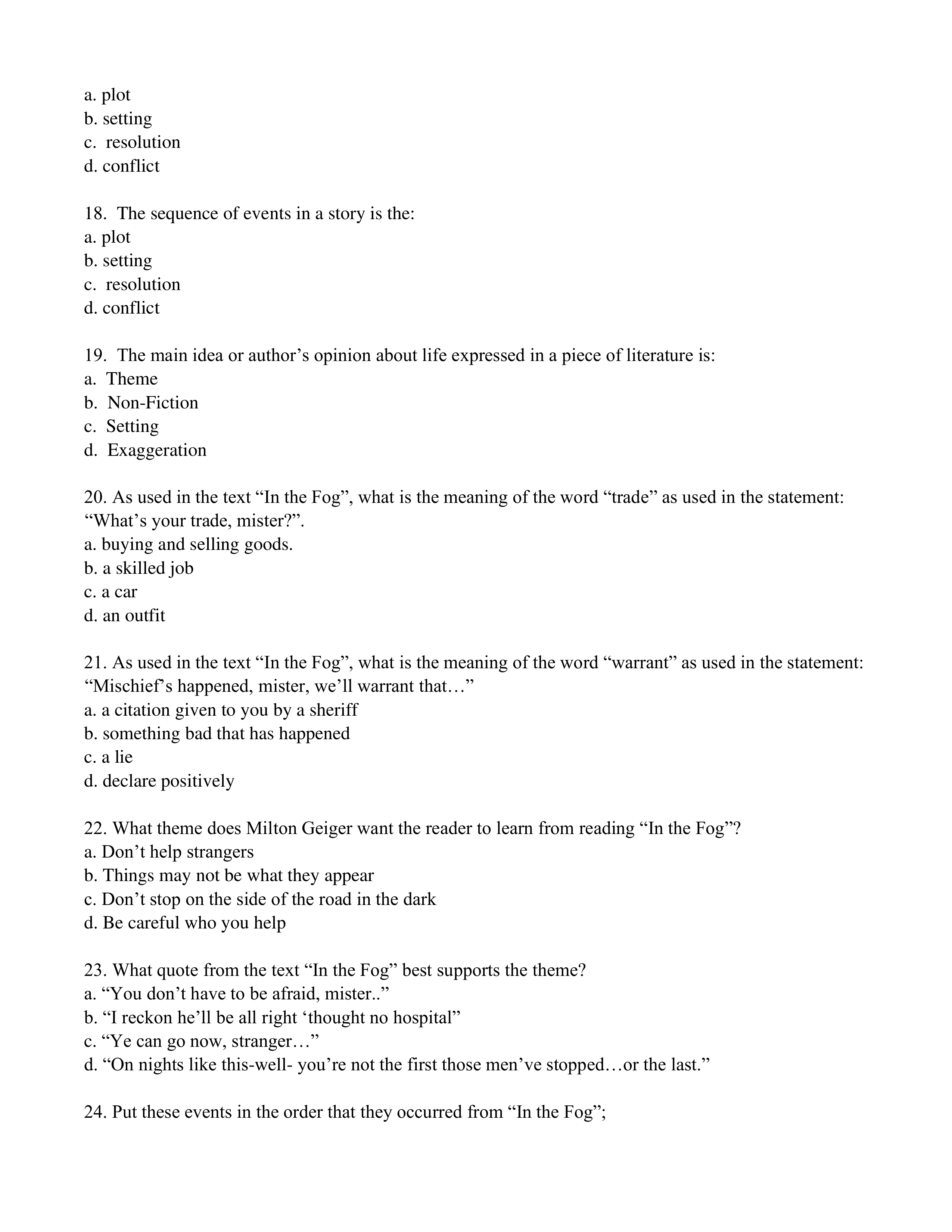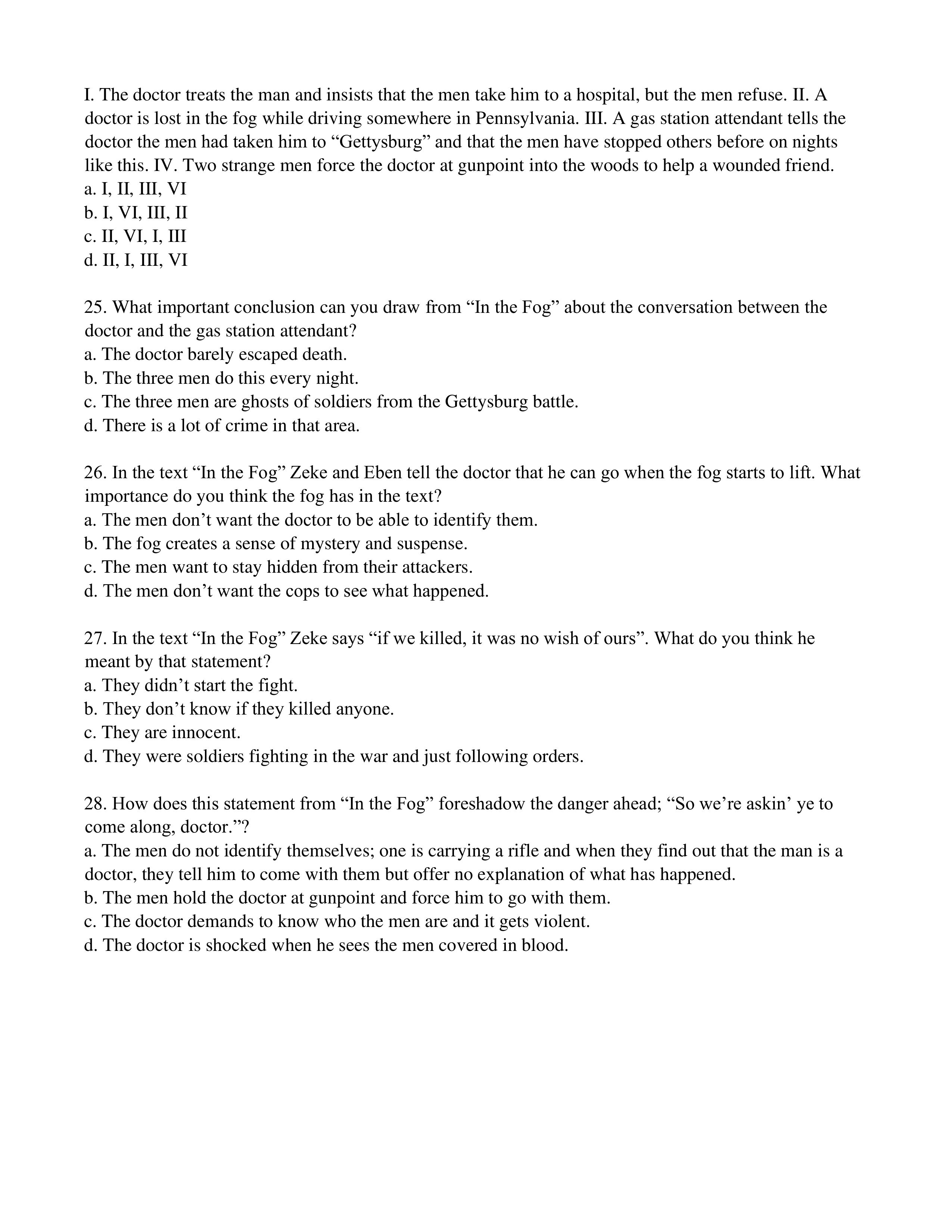 . Put these events in the order that they occurred from “In the Fog”;I. The doctor treats the man and insists that the men take him to a hospital, but the men refuse. II. A doctor is lost in the fog while driving somewhere in Pennsylvania. III. A gas station attendant tells the doctor the men had taken him to “Gettysburg” and that the men have stopped others before on nights like this. IV. Two strange men force the doctor at gunpoint into the woods to help a wounded friend.