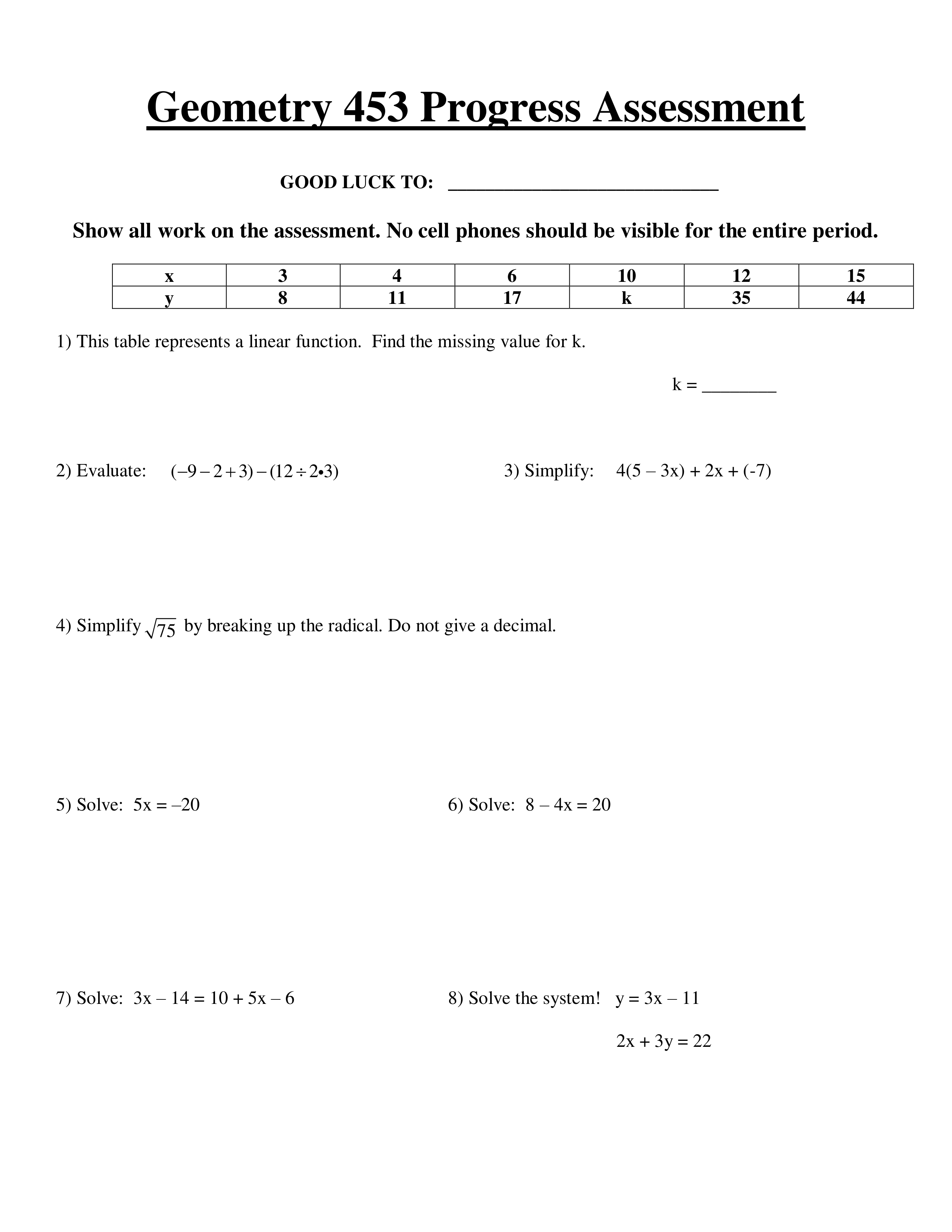 This table represents a linear function. Find the missing value for k. Do not use any spaces in your answer.