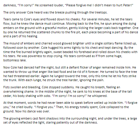 Cole also states "I forgive you" during his anger dance. Who do you think Cole is forgiving and why?