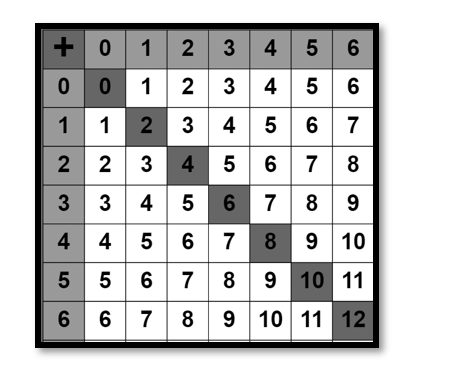 Look at the addition table. Describe the pattern created by the highlighted numbers.