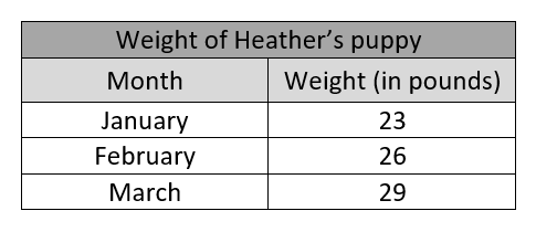Heather weighs her puppy each month. The table shows the weight of the puppy for January, February, and March.
